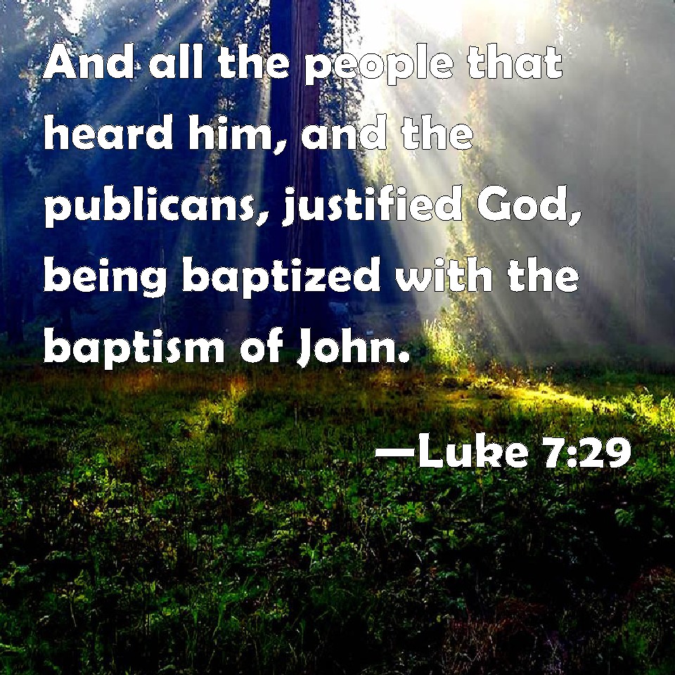 Choose a Background Luke 7:29 And all the people that heard him, and the publicans, justified God, being baptized with the baptism of John. KJV: And all the people that heard him, and the publicans, justified God, being baptized with the baptism of John. DRB: And all the people hearing, and the publicans, justified God, being baptized with John's baptism. DBT: (And all the people who heard it, and the tax-gatherers, justified God, having been baptised with the baptism of John; ERV: And all the people when they heard, and the publicans, justified God, being baptized with the baptism of John. WBT: And all the people that heard him, and the publicans, justified God, being baptized with the baptism of John. WEB: When all the people and the tax collectors heard this, they declared God to be just, having been baptized with John's baptism. YLT: And all the people having heard, and the tax-gatherers, declared God righteous, having been baptized with the baptism of John,Links Luke 7:29 NIV • Luke 7:29 NLT • Luke 7:29 ESV • Luke 7:29 NASB • Luke 7:29 KJV • Luke 7:29 Interlinear • Luke 7:29 Commentaries • Luke 7:29 Parallel Texts • Luke 7:29 Bible Apps • Luke 7:29 Parallel • Bible Hub |