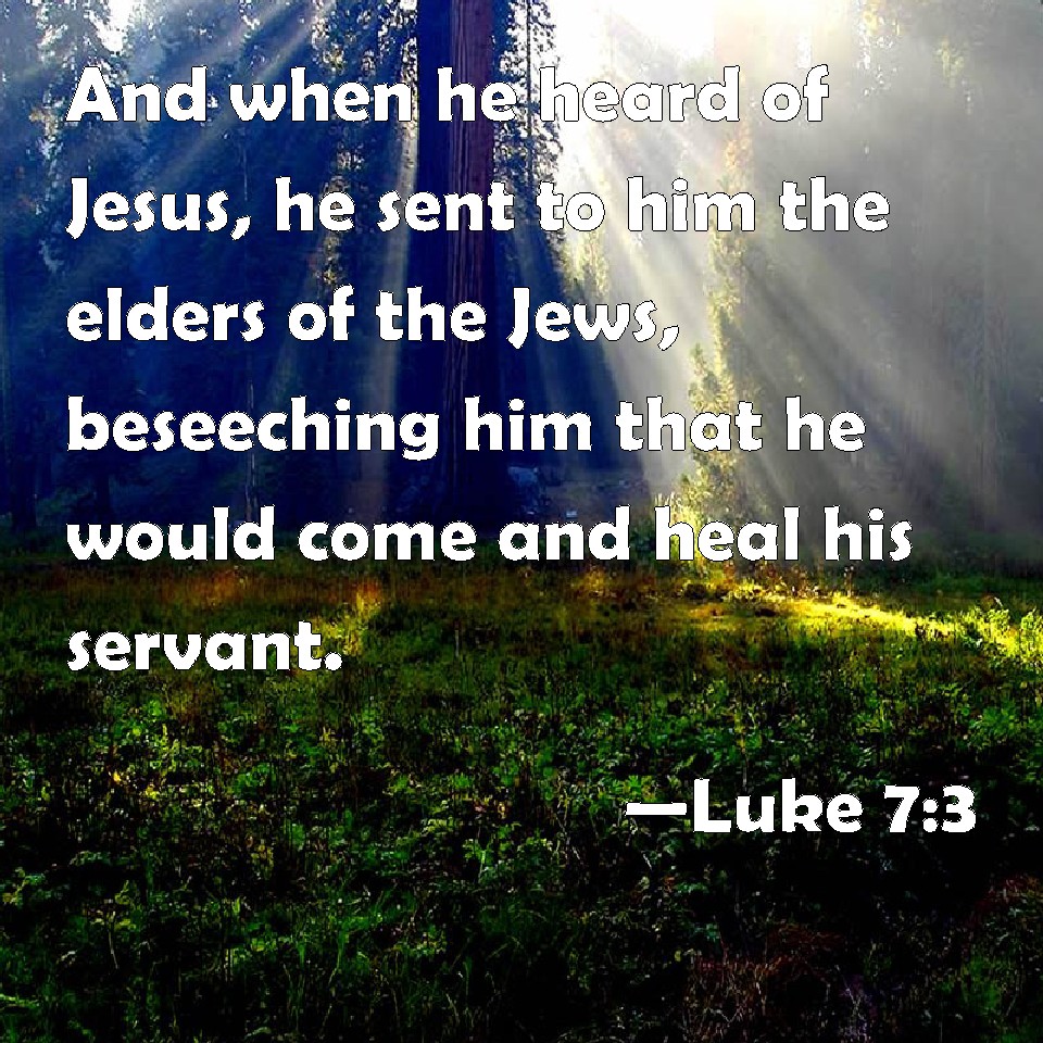 Choose a Background Luke 7:3 And when he heard of Jesus, he sent to him the elders of the Jews, beseeching him that he would come and heal his servant. KJV: And when he heard of Jesus, he sent unto him the elders of the Jews, beseeching him that he would come and heal his servant. DRB: And when he had heard of Jesus, he sent unto him the ancients of the Jews, desiring him to come and heal his servant. DBT: and having heard of Jesus, he sent to him elders of the Jews, begging him that he might come and save his bondman. ERV: And when he heard concerning Jesus, he sent unto him elders of the Jews, asking him that he would come and save his servant. WBT: And when he heard of Jesus, he sent to him the elders of the Jews, beseeching him that he would come and heal his servant. WEB: When he heard about Jesus, he sent to him elders of the Jews, asking him to come and save his servant. YLT: and having heard about Jesus, he sent unto him elders of the Jews, beseeching him, that having come he might thoroughly save his servant.Links Luke 7:3 NIV • Luke 7:3 NLT • Luke 7:3 ESV • Luke 7:3 NASB • Luke 7:3 KJV • Luke 7:3 Interlinear • Luke 7:3 Commentaries • Luke 7:3 Parallel Texts • Luke 7:3 Bible Apps • Luke 7:3 Parallel • Bible Hub |