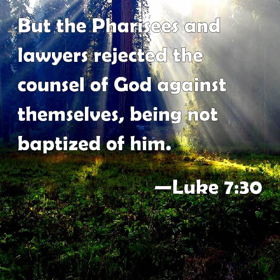 Choose a Background Luke 7:30 But the Pharisees and lawyers rejected the counsel of God against themselves, being not baptized of him. KJV: But the Pharisees and lawyers rejected the counsel of God against themselves, being not baptized of him. DRB: But the Pharisees and the lawyers despised the counsel of God against themselves, being not baptized by him. DBT: but the Pharisees and the lawyers rendered null as to themselves the counsel of God, not having been baptised by him.) ERV: But the Pharisees and the lawyers rejected for themselves the counsel of God, being not baptized of him. WBT: But the Pharisees and lawyers rejected the counsel of God against themselves, being not baptized by him. WEB: But the Pharisees and the lawyers rejected the counsel of God, not being baptized by him themselves. YLT: but the Pharisees, and the lawyers, the counsel of God did put away for themselves, not having been baptized by him.Links Luke 7:30 NIV • Luke 7:30 NLT • Luke 7:30 ESV • Luke 7:30 NASB • Luke 7:30 KJV • Luke 7:30 Interlinear • Luke 7:30 Commentaries • Luke 7:30 Parallel Texts • Luke 7:30 Bible Apps • Luke 7:30 Parallel • Bible Hub |