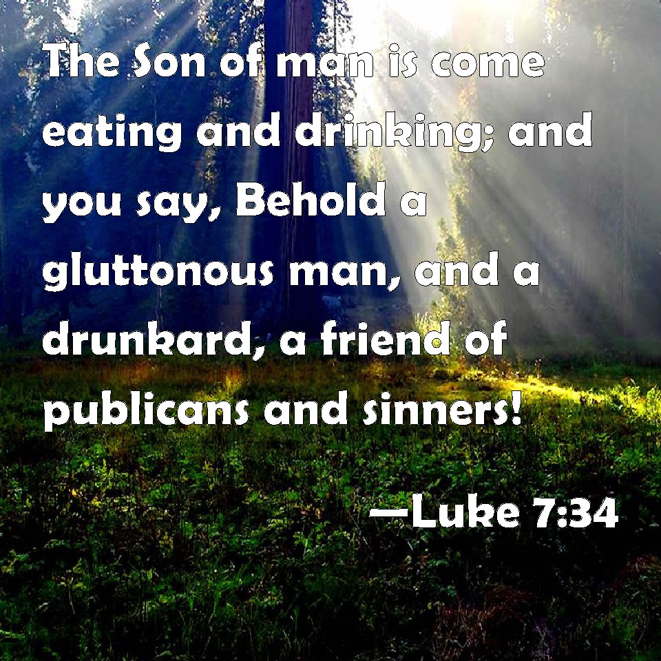 Choose a Background Luke 7:34 The Son of man is come eating and drinking; and you say, Behold a gluttonous man, and a drunkard, a friend of publicans and sinners! KJV: The Son of man is come eating and drinking; and ye say, Behold a gluttonous man, and a winebibber, a friend of publicans and sinners! DRB: The Son of man is come eating and drinking: and you say: Behold a man that is a glutton and a drinker of wine, a friend of publicans and sinners. DBT: The Son of man has come eating and drinking, and ye say, Behold an eater and wine-drinker, a friend of tax-gatherers and sinners; ERV: The Son of man is come eating and drinking; and ye say, Behold, a gluttonous man, and a winebibber, a friend of publicans and sinners! WBT: The Son of man is come eating and drinking; and ye say, Behold, a gluttonous man, and a wine-bibber, a friend of publicans and sinners. WEB: The Son of Man has come eating and drinking, and you say, 'Behold, a gluttonous man, and a drunkard; a friend of tax collectors and sinners!' YLT: the Son of Man came eating and drinking, and ye say, Lo, a man, a glutton, and a wine drinker, a friend of tax-gatherers and sinners;Links Luke 7:34 NIV • Luke 7:34 NLT • Luke 7:34 ESV • Luke 7:34 NASB • Luke 7:34 KJV • Luke 7:34 Interlinear • Luke 7:34 Commentaries • Luke 7:34 Parallel Texts • Luke 7:34 Bible Apps • Luke 7:34 Parallel • Bible Hub |