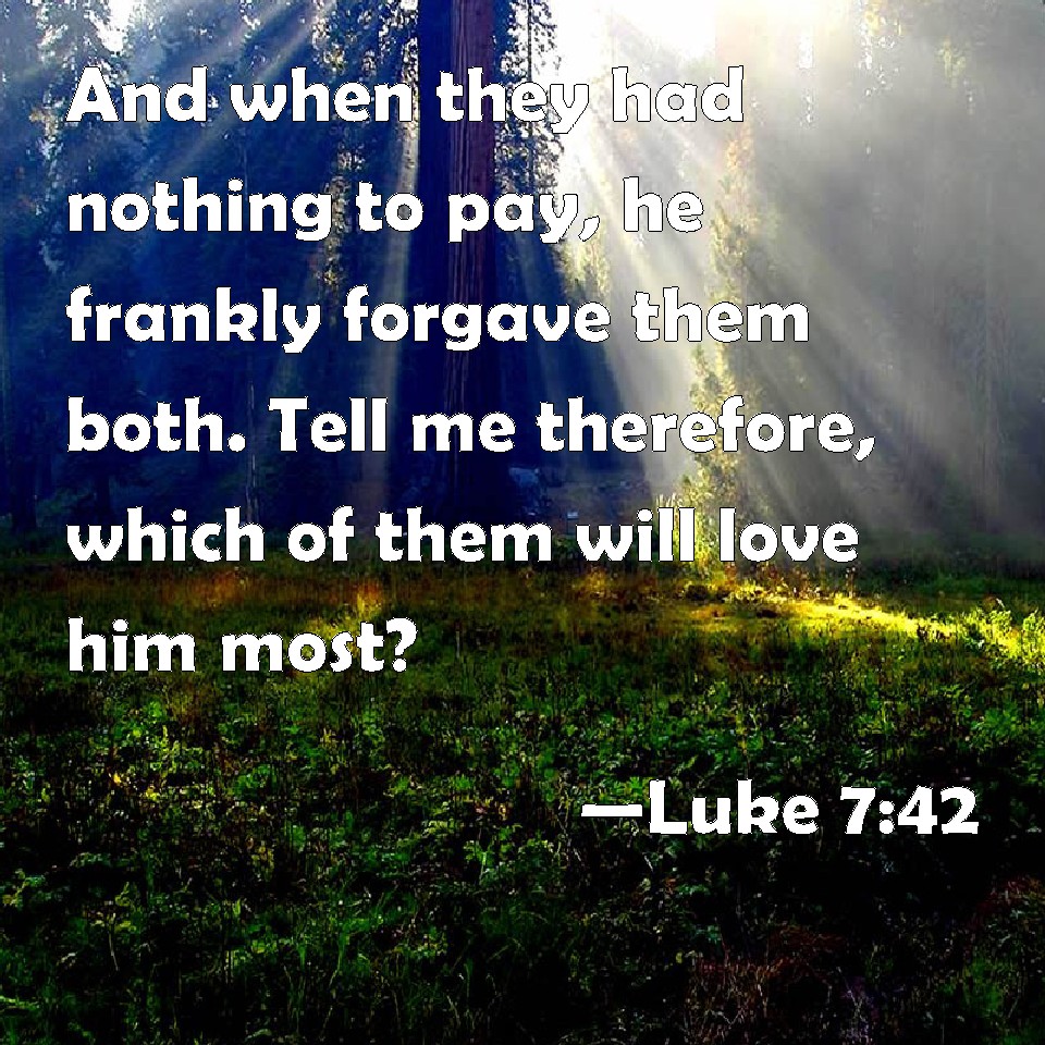 Choose a Background Luke 7:42 And when they had nothing to pay, he frankly forgave them both. Tell me therefore, which of them will love him most? KJV: And when they had nothing to pay, he frankly forgave them both. Tell me therefore, which of them will love him most? DRB: And whereas they had not wherewith to pay, he forgave them both. Which therefore of the two loveth him most? DBT: but as they had nothing to pay, he forgave both of them their debt: say, which of them therefore will love him most? ERV: When they had not wherewith to pay, he forgave them both. Which of them therefore will love him most? WBT: And when they had nothing to pay, he frankly forgave them both. Tell me therefore, which of them will love him most? WEB: When they couldn't pay, he forgave them both. Which of them therefore will love him most?" YLT: and they not having wherewith to give back, he forgave both; which then of them, say thou, will love him more?'Links Luke 7:42 NIV • Luke 7:42 NLT • Luke 7:42 ESV • Luke 7:42 NASB • Luke 7:42 KJV • Luke 7:42 Interlinear • Luke 7:42 Commentaries • Luke 7:42 Parallel Texts • Luke 7:42 Bible Apps • Luke 7:42 Parallel • Bible Hub |