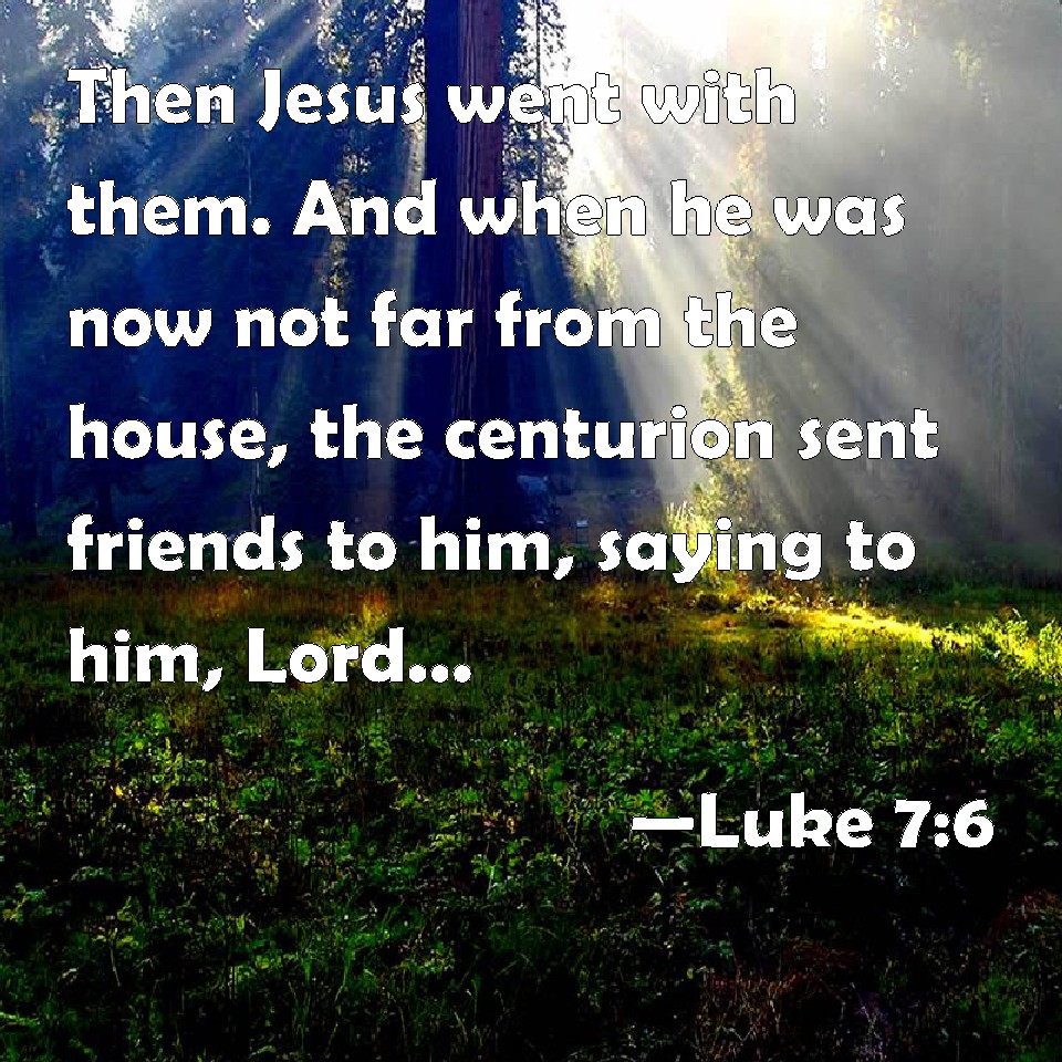 Choose a Background Luke 7:6 Then Jesus went with them. And when he was now not far from the house, the centurion sent friends to him, saying to him, Lord, trouble not yourself: for I am not worthy that you should enter under my roof: KJV: Then Jesus went with them. And when he was now not far from the house, the centurion sent friends to him, saying unto him, Lord, trouble not thyself: for I am not worthy that thou shouldest enter under my roof: DRB: And Jesus went with them. And when he was now not far from the house, the centurion sent his friends to him, saying: Lord, trouble not thyself; for I am not worthy that thou shouldest enter under my roof. DBT: And Jesus went with them. But already, when he was not far from the house, the centurion sent to him friends, saying to him, Lord, do not trouble thyself, for I am not worthy that thou shouldest enter under my roof. ERV: And Jesus went with them. And when he was now not far from the house, the centurion sent friends to him, saying unto him, Lord, trouble not thyself: for I am not worthy that thou shouldest come under my roof: WBT: Then Jesus went with them. And when he was now not far from the house, the centurion sent friends to him, saying to him, Lord, trouble not thyself: for I am not worthy that thou shouldest enter under my roof; WEB: Jesus went with them. When he was now not far from the house, the centurion sent friends to him, saying to him, "Lord, don't trouble yourself, for I am not worthy for you to come under my roof. YLT: And Jesus was going on with them, and now when he is not far distant from the house the centurion sent unto him friends, saying to him, 'Sir, be not troubled, for I am not worthy that under my roof thou mayest enter;Links Luke 7:6 NIV • Luke 7:6 NLT • Luke 7:6 ESV • Luke 7:6 NASB • Luke 7:6 KJV • Luke 7:6 Interlinear • Luke 7:6 Commentaries • Luke 7:6 Parallel Texts • Luke 7:6 Bible Apps • Luke 7:6 Parallel • Bible Hub |