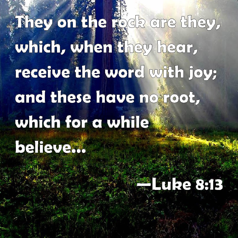 Choose a Background Luke 8:13 They on the rock are they, which, when they hear, receive the word with joy; and these have no root, which for a while believe, and in time of temptation fall away. KJV: They on the rock are they, which, when they hear, receive the word with joy; and these have no root, which for a while believe, and in time of temptation fall away. DRB: Now they upon the rock, are they who when they hear, receive the word with joy: and these have no roots; for they believe for a while, and in time of temptation, they fall away. DBT: But those upon the rock, those who when they hear receive the word with joy; and these have no root, who believe for a time, and in time of trial fall away. ERV: And those on the rock are they which, when they have heard, receive the word with joy; and these have no root, which for a while believe, and in time of temptation fall away. WBT: They on the rock are they, who, when they hear, receive the word with joy; and these have no root, who for a while believe, and in time of temptation fall away. WEB: Those on the rock are they who, when they hear, receive the word with joy; but these have no root, who believe for a while, then fall away in time of temptation. YLT: 'And those upon the rock: They who, when they may hear, with joy do receive the word, and these have no root, who for a time believe, and in time of temptation fall away.Links Luke 8:13 NIV • Luke 8:13 NLT • Luke 8:13 ESV • Luke 8:13 NASB • Luke 8:13 KJV • Luke 8:13 Interlinear • Luke 8:13 Commentaries • Luke 8:13 Parallel Texts • Luke 8:13 Bible Apps • Luke 8:13 Parallel • Bible Hub |