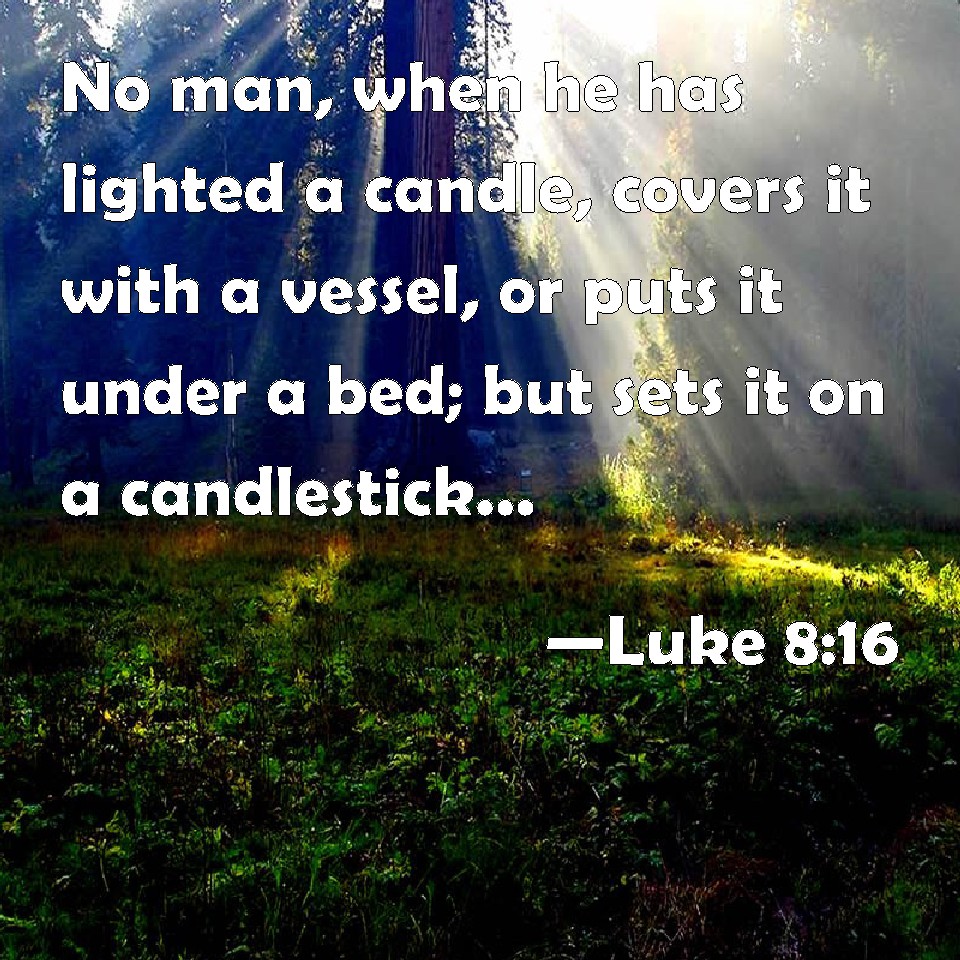 Choose a Background Luke 8:16 No man, when he has lighted a candle, covers it with a vessel, or puts it under a bed; but sets it on a candlestick, that they which enter in may see the light. KJV: No man, when he hath lighted a candle, covereth it with a vessel, or putteth it under a bed; but setteth it on a candlestick, that they which enter in may see the light. DRB: Now no man lighting a candle covereth it with a vessel, or putteth it under a bed; but setteth it upon a candlestick, that they who come in may see the light. DBT: And no one having lighted a lamp covers it with a vessel or puts it under a couch, but sets it on a lamp-stand, that they who enter in may see the light. ERV: And no man, when he hath lighted a lamp, covereth it with a vessel, or putteth it under a bed; but putteth it on a stand, that they which enter in may see the light. WBT: No man, when he hath lighted a candle, covereth it with a vessel, or putteth it under a bed; but setteth it on a candlestick, that they who enter in may see the light. WEB: "No one, when he has lit a lamp, covers it with a container, or puts it under a bed; but puts it on a stand, that those who enter in may see the light. YLT: And no one having lighted a lamp doth cover it with a vessel, or under a couch doth put it; but upon a lamp-stand he doth put it, that those coming in may see the light,Links Luke 8:16 NIV • Luke 8:16 NLT • Luke 8:16 ESV • Luke 8:16 NASB • Luke 8:16 KJV • Luke 8:16 Interlinear • Luke 8:16 Commentaries • Luke 8:16 Parallel Texts • Luke 8:16 Bible Apps • Luke 8:16 Parallel • Bible Hub |