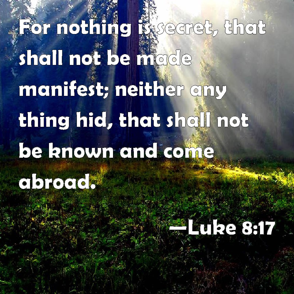 Choose a Background Luke 8:17 For nothing is secret, that shall not be made manifest; neither any thing hid, that shall not be known and come abroad. KJV: For nothing is secret, that shall not be made manifest; neither any thing hid, that shall not be known and come abroad. DRB: For there is not any thing secret that shall not be made manifest, nor hidden, that shall not be known and come abroad. DBT: For there is nothing hid which shall not become manifest, nor secret which shall not be known and come to light. ERV: For nothing is hid, that shall not be made manifest; nor anything secret, that shall not be known and come to light. WBT: For nothing is secret, that shall not be made manifest; neither any thing hid, that shall not be known, and come abroad. WEB: For nothing is hidden, that will not be revealed; nor anything secret, that will not be known and come to light. YLT: for nothing is secret, that shall not become manifest, nor hid, that shall not be known, and become manifest.Links Luke 8:17 NIV • Luke 8:17 NLT • Luke 8:17 ESV • Luke 8:17 NASB • Luke 8:17 KJV • Luke 8:17 Interlinear • Luke 8:17 Commentaries • Luke 8:17 Parallel Texts • Luke 8:17 Bible Apps • Luke 8:17 Parallel • Bible Hub |