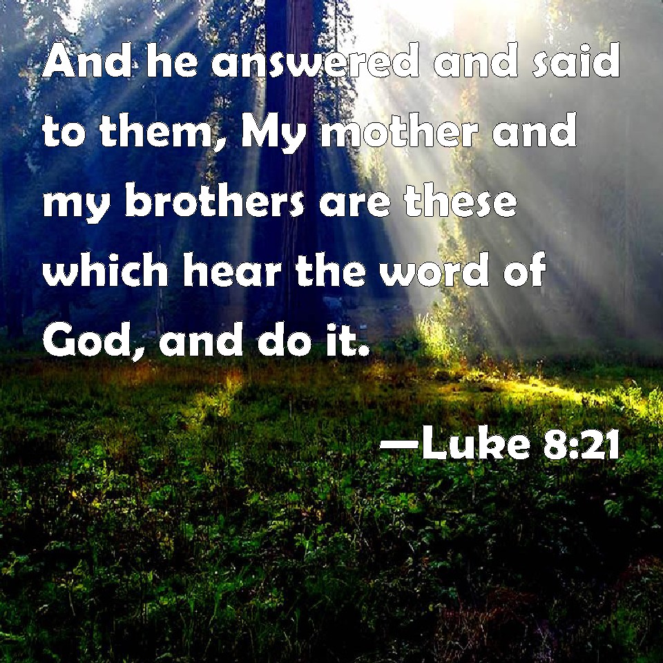 Choose a Background Luke 8:21 And he answered and said to them, My mother and my brothers are these which hear the word of God, and do it. KJV: And he answered and said unto them, My mother and my brethren are these which hear the word of God, and do it. DRB: Who answering, said to them: My mother and my brethren are they who hear the word of God, and do it. DBT: But he answering said to them, My mother and my brethren are those who hear the word of God and do it. ERV: But he answered and said unto them, My mother and my brethren are these which hear the word of God, and do it. WBT: And he answered and said to them, My mother and my brethren are these who hear the word of God, and do it. WEB: But he answered them, "My mother and my brothers are these who hear the word of God, and do it." YLT: and he answering said unto them, 'My mother and my brethren! they are those who the word of God are hearing, and doing.'Links Luke 8:21 NIV • Luke 8:21 NLT • Luke 8:21 ESV • Luke 8:21 NASB • Luke 8:21 KJV • Luke 8:21 Interlinear • Luke 8:21 Commentaries • Luke 8:21 Parallel Texts • Luke 8:21 Bible Apps • Luke 8:21 Parallel • Bible Hub |
