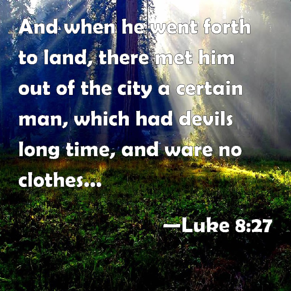 Choose a Background Luke 8:27 And when he went forth to land, there met him out of the city a certain man, which had devils long time, and ware no clothes, neither stayed in any house, but in the tombs. KJV: And when he went forth to land, there met him out of the city a certain man, which had devils long time, and ware no clothes, neither abode in any house, but in the tombs. DRB: And when he was come forth to the land, there met him a certain man who had a devil now a very long time, and he wore no clothes, neither did he abide in a house, but in the sepulchres. DBT: And as he got out of the ship on the land, a certain man out of the city met him, who had demons a long time, and put on no clothes, and did not abide in a house, but in the tombs. ERV: And when he was come forth upon the land, there met him a certain man out of the city, who had devils; and for a long time he had worn no clothes, and abode not in any house, but in the tombs. WBT: And when he went forth to land, there met him out of the city a certain man, who had demons a long time, and wore no clothes, neither abode in any house, but in the tombs. WEB: When Jesus stepped ashore, a certain man out of the city who had demons for a long time met him. He wore no clothes, and didn't live in a house, but in the tombs. YLT: and he having gone forth upon the land, there met him a certain man, out of the city, who had demons for a long time, and with a garment was not clothed, and in a house was not abiding, but in the tombs,Links Luke 8:27 NIV • Luke 8:27 NLT • Luke 8:27 ESV • Luke 8:27 NASB • Luke 8:27 KJV • Luke 8:27 Interlinear • Luke 8:27 Commentaries • Luke 8:27 Parallel Texts • Luke 8:27 Bible Apps • Luke 8:27 Parallel • Bible Hub |