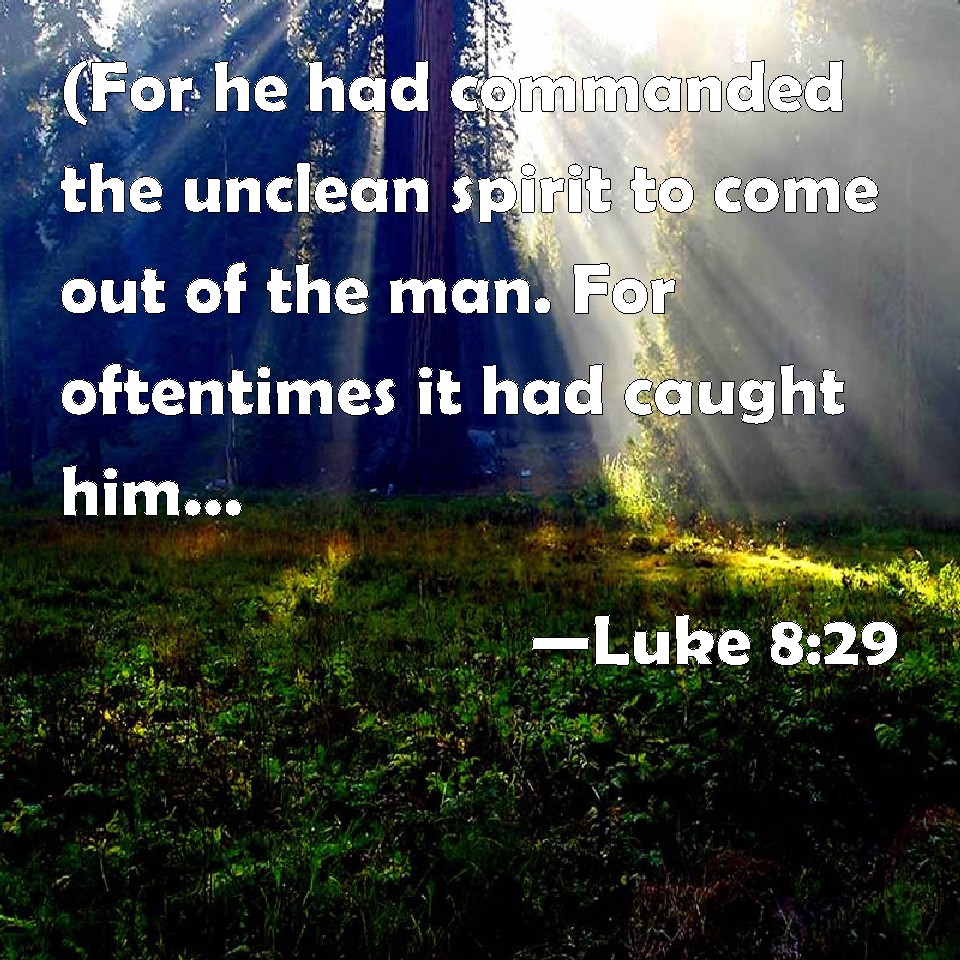 Choose a Background Luke 8:29 (For he had commanded the unclean spirit to come out of the man. For oftentimes it had caught him: and he was kept bound with chains and in fetters; and he broke the bands, and was driven of the devil into the wilderness.) KJV: (For he had commanded the unclean spirit to come out of the man. For oftentimes it had caught him: and he was kept bound with chains and in fetters; and he brake the bands, and was driven of the devil into the wilderness.) DRB: For he commanded the unclean spirit to go out of the man. For many times it seized him, and he was bound with chains, and kept in fetters; and breaking the bonds, he was driven by the devil into the deserts. DBT: For he had commanded the unclean spirit to go out from the man. For very often it had seized him; and he had been bound, kept with chains and fetters; and breaking the bonds he was driven by the demon into the deserts. ERV: For he commanded the unclean spirit to come out from the man. For oftentimes it had seized him: and he was kept under guard, and bound with chains and fetters; and breaking the bands asunder, he was driven of the devil into the deserts. WBT: (For he had commanded the unclean spirit to come out of the man. For often it had caught him, and he was kept bound with chains, and in fetters: and he broke the bands, and was driven by the demon into the wilderness.) WEB: For Jesus was commanding the unclean spirit to come out of the man. For the unclean spirit had often seized the man. He was kept under guard, and bound with chains and fetters. Breaking the bands apart, he was driven by the demon into the desert. YLT: For he commanded the unclean spirit to come forth from the man, for many times it had caught him, and he was being bound with chains and fetters — guarded, and breaking asunder the bonds he was driven by the demons to the deserts.Links Luke 8:29 NIV • Luke 8:29 NLT • Luke 8:29 ESV • Luke 8:29 NASB • Luke 8:29 KJV • Luke 8:29 Interlinear • Luke 8:29 Commentaries • Luke 8:29 Parallel Texts • Luke 8:29 Bible Apps • Luke 8:29 Parallel • Bible Hub |