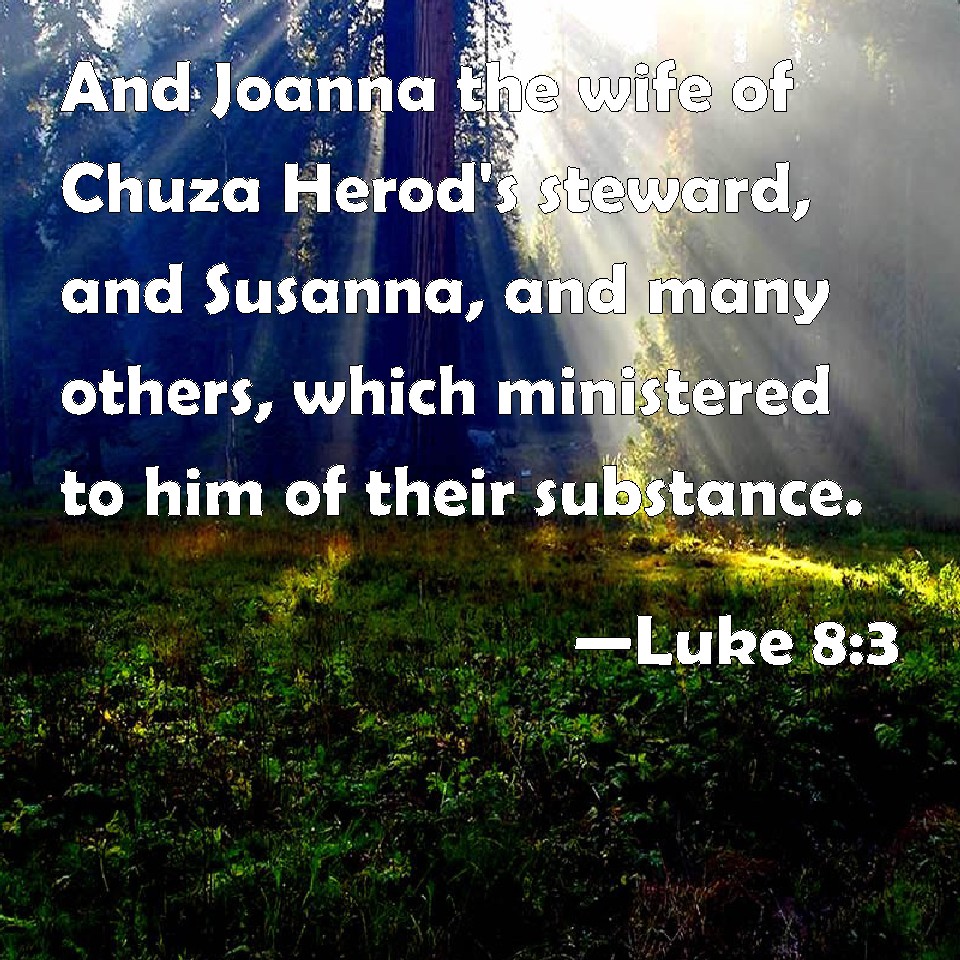 Choose a Background Luke 8:3 And Joanna the wife of Chuza Herod's steward, and Susanna, and many others, which ministered to him of their substance. KJV: And Joanna the wife of Chuza Herod's steward, and Susanna, and many others, which ministered unto him of their substance. DRB: And Joanna the wife of Chusa, Herod's steward, and Susanna, and many others who ministered unto him of their substance. DBT: and Joanna, wife of Chuza, Herod's steward, and Susanna, and many others, who ministered to him of their substance. ERV: and Joanna the wife of Chuza Herod's steward, and Susanna, and many others, which ministered unto them of their substance. WBT: And Joanna the wife of Chuza Herod's steward, and Susanna, and many others, who ministered to him of their substance. WEB: and Joanna, the wife of Chuzas, Herod's steward; Susanna; and many others; who served them from their possessions. YLT: and Joanna wife of Chuza, steward of Herod, and Susanna, and many others, who were ministering to him from their substance.Links Luke 8:3 NIV • Luke 8:3 NLT • Luke 8:3 ESV • Luke 8:3 NASB • Luke 8:3 KJV • Luke 8:3 Interlinear • Luke 8:3 Commentaries • Luke 8:3 Parallel Texts • Luke 8:3 Bible Apps • Luke 8:3 Parallel • Bible Hub |