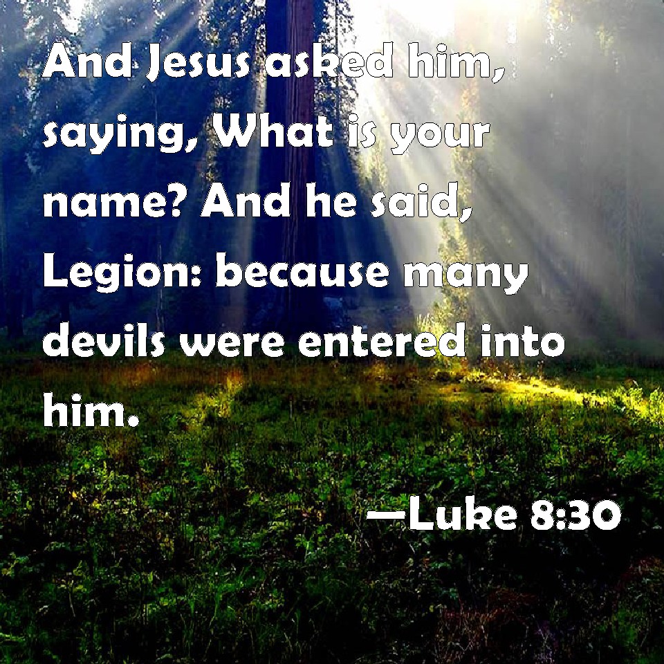 Choose a Background Luke 8:30 And Jesus asked him, saying, What is your name? And he said, Legion: because many devils were entered into him. KJV: And Jesus asked him, saying, What is thy name? And he said, Legion: because many devils were entered into him. DRB: And Jesus asked him, saying: What is thy name? But he said: Legion; because many devils were entered into him. DBT: And Jesus asked him saying, What is thy name? And he said, Legion: for many demons had entered into him. ERV: And Jesus asked him, What is thy name? And he said, Legion; for many devils were entered into him. WBT: And Jesus asked him, saying, What is thy name? And he said, Legion: because many demons had entered into him. WEB: Jesus asked him, "What is your name?" He said, "Legion," for many demons had entered into him. YLT: And Jesus questioned him, saying, 'What is thy name?' and he said, 'Legion,' (because many demons were entered into him,)Links Luke 8:30 NIV • Luke 8:30 NLT • Luke 8:30 ESV • Luke 8:30 NASB • Luke 8:30 KJV • Luke 8:30 Interlinear • Luke 8:30 Commentaries • Luke 8:30 Parallel Texts • Luke 8:30 Bible Apps • Luke 8:30 Parallel • Bible Hub |