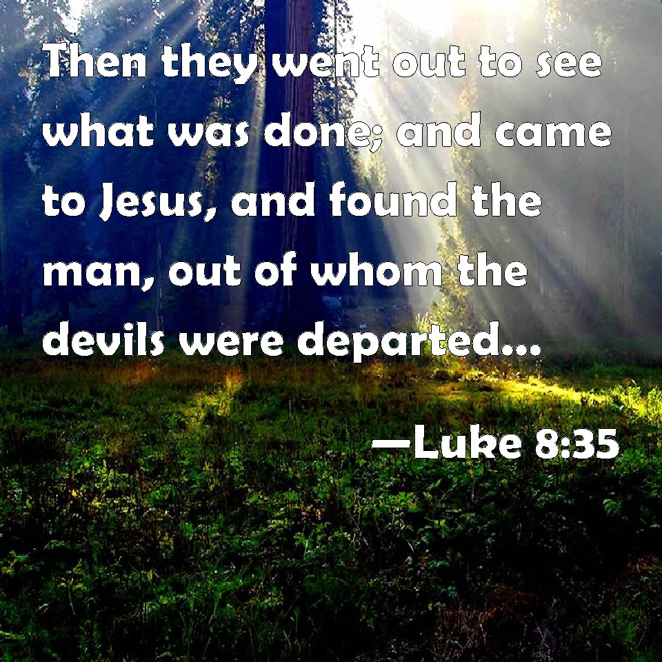 Choose a Background Luke 8:35 Then they went out to see what was done; and came to Jesus, and found the man, out of whom the devils were departed, sitting at the feet of Jesus, clothed, and in his right mind: and they were afraid. KJV: Then they went out to see what was done; and came to Jesus, and found the man, out of whom the devils were departed, sitting at the feet of Jesus, clothed, and in his right mind: and they were afraid. DRB: And they went out to see what was done; and they came to Jesus, and found the man, out of whom the devils were departed, sitting at his feet, clothed, and in his right mind; and they were afraid. DBT: And they went out to see what had happened, and came to Jesus, and found the man from whom the demons had gone out, sitting, clothed and sensible, at the feet of Jesus. And they were afraid. ERV: And they went out to see what had come to pass; and they came to Jesus, and found the man, from whom the devils were gone out, sitting, clothed and in his right mind, at the feet of Jesus: and they were afraid. WBT: Then they went out to see what was done; and came to Jesus, and found the man out of whom the demons had departed, sitting at the feet of Jesus, clothed, and in his right mind: and they were afraid. WEB: People went out to see what had happened. They came to Jesus, and found the man from whom the demons had gone out, sitting at Jesus' feet, clothed and in his right mind; and they were afraid. YLT: and they came forth to see what was come to pass, and they came unto Jesus, and found the man sitting, out of whom the demons had gone forth, clothed, and right-minded, at the feet of Jesus, and they were afraid;Links Luke 8:35 NIV • Luke 8:35 NLT • Luke 8:35 ESV • Luke 8:35 NASB • Luke 8:35 KJV • Luke 8:35 Interlinear • Luke 8:35 Commentaries • Luke 8:35 Parallel Texts • Luke 8:35 Bible Apps • Luke 8:35 Parallel • Bible Hub |
