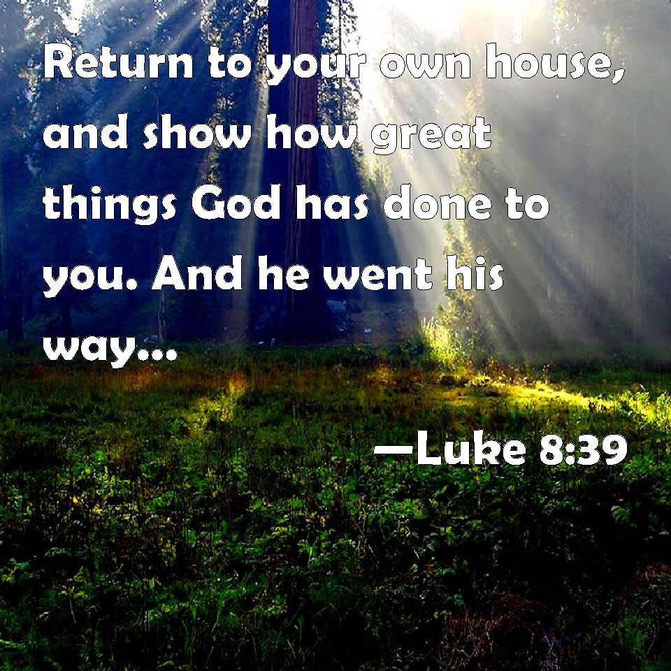 Choose a Background Luke 8:39 Return to your own house, and show how great things God has done to you. And he went his way, and published throughout the whole city how great things Jesus had done to him. KJV: Return to thine own house, and shew how great things God hath done unto thee. And he went his way, and published throughout the whole city how great things Jesus had done unto him. DRB: Return to thy house, and tell how great things God hath done to thee. And he went through the whole city, publishing how great things Jesus had done to him. DBT: Return to thine house and relate how great things God has done for thee. And he went away through the whole city, publishing how great things Jesus had done for him. ERV: Return to thy house, and declare how great things God hath done for thee. And he went his way, publishing throughout the whole city how great things Jesus had done for him. WBT: Return to thy own house, and show how great things God hath done to thee. And he went away and published throughout the whole city, how great things Jesus had done to him. WEB: "Return to your house, and declare what great things God has done for you." He went his way, proclaiming throughout the whole city what great things Jesus had done for him. YLT: 'Turn back to thy house, and tell how great things God did to thee;' and he went away through all the city proclaiming how great things Jesus did to him.Links Luke 8:39 NIV • Luke 8:39 NLT • Luke 8:39 ESV • Luke 8:39 NASB • Luke 8:39 KJV • Luke 8:39 Interlinear • Luke 8:39 Commentaries • Luke 8:39 Parallel Texts • Luke 8:39 Bible Apps • Luke 8:39 Parallel • Bible Hub |