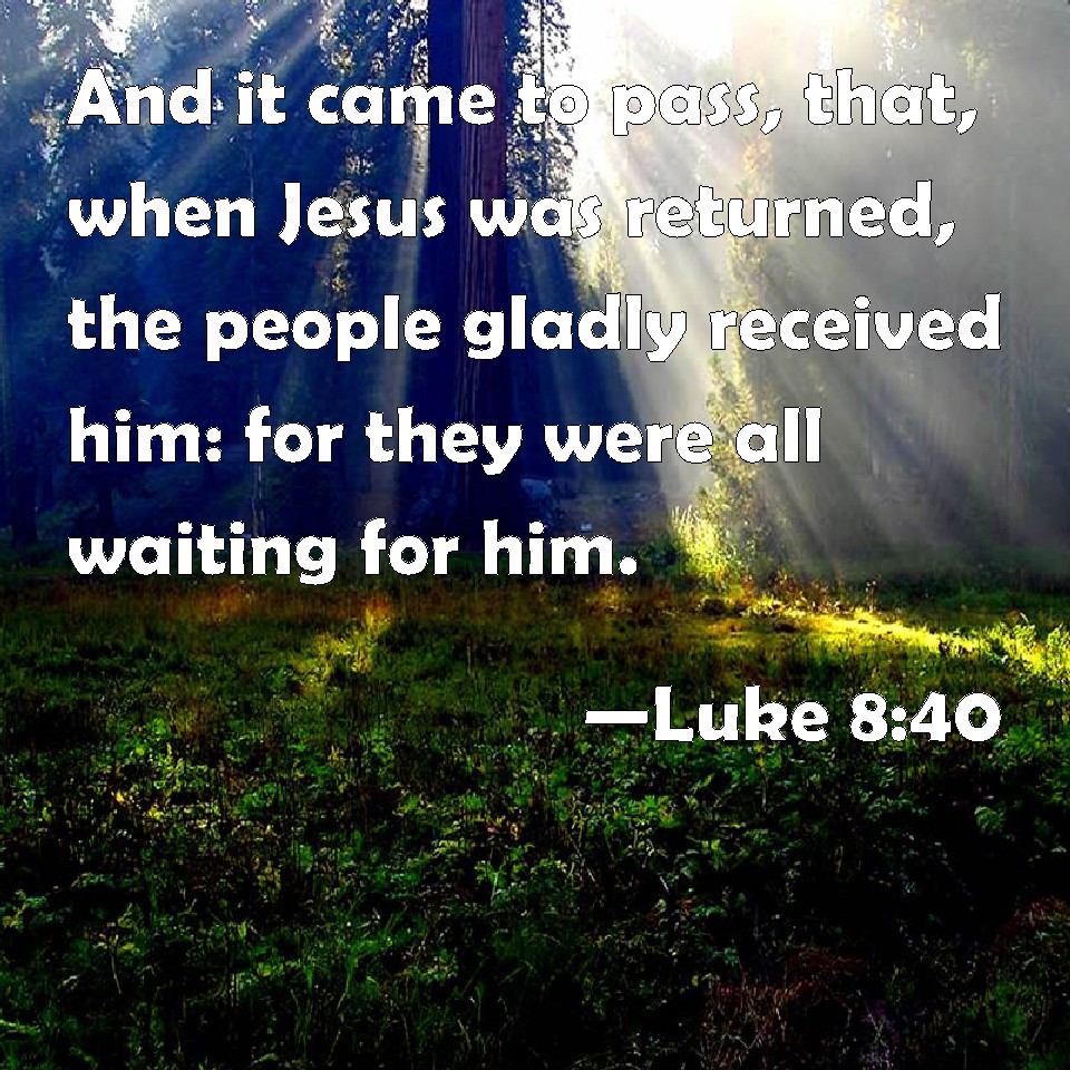 Choose a Background Luke 8:40 And it came to pass, that, when Jesus was returned, the people gladly received him: for they were all waiting for him. KJV: And it came to pass, that, when Jesus was returned, the people gladly received him: for they were all waiting for him. DRB: And it came to pass, that when Jesus was returned, the multitude received him: for they were all waiting for him. DBT: And it came to pass when Jesus returned, the crowd received him gladly, for they were all expecting him. ERV: And as Jesus returned, the multitude welcomed him; for they were all waiting for him. WBT: And it came to pass, that, when Jesus had returned, the people gladly received him: for they were all waiting for him. WEB: It happened, when Jesus returned, that the multitude welcomed him, for they were all waiting for him. YLT: And it came to pass, in the turning back of Jesus, the multitude received him, for they were all looking for him,Links Luke 8:40 NIV • Luke 8:40 NLT • Luke 8:40 ESV • Luke 8:40 NASB • Luke 8:40 KJV • Luke 8:40 Interlinear • Luke 8:40 Commentaries • Luke 8:40 Parallel Texts • Luke 8:40 Bible Apps • Luke 8:40 Parallel • Bible Hub |
