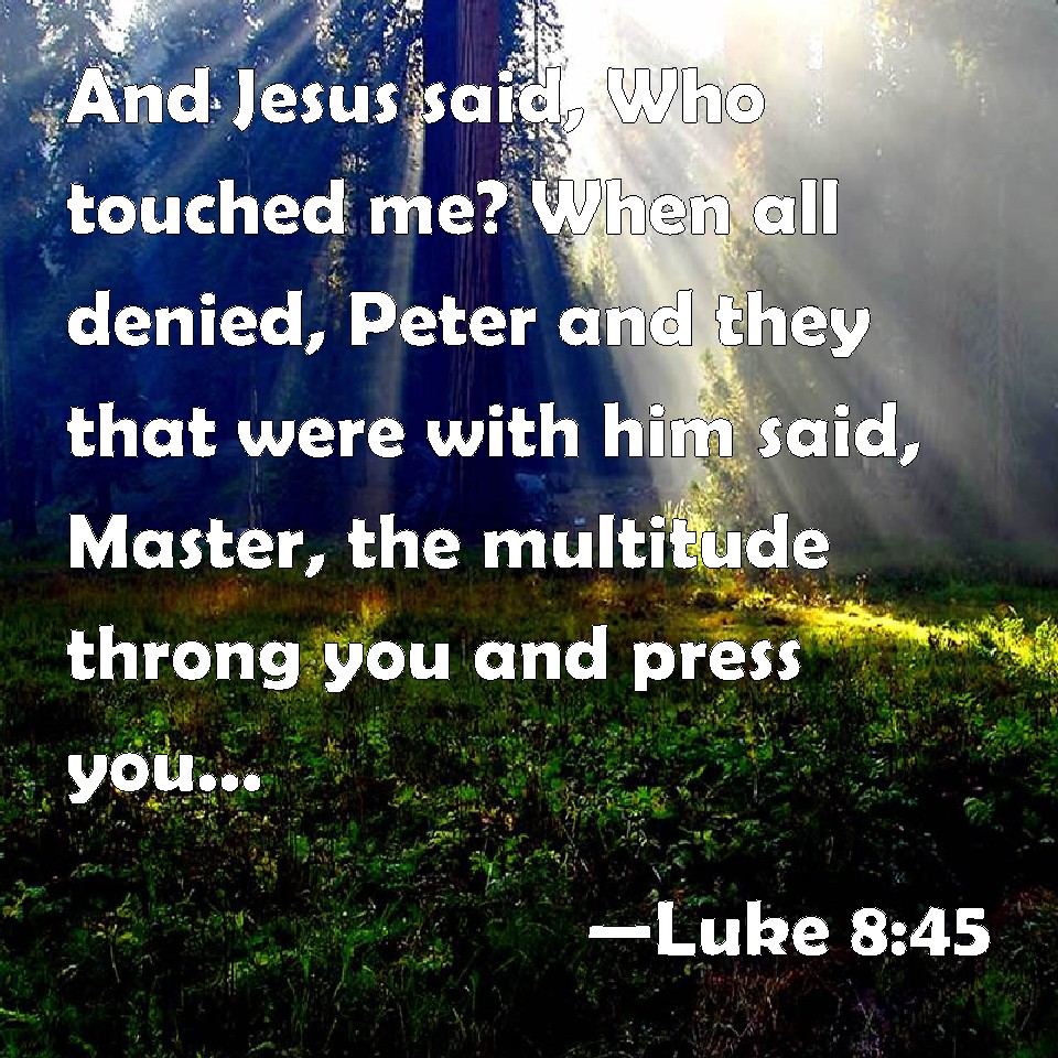 Choose a Background Luke 8:45 And Jesus said, Who touched me? When all denied, Peter and they that were with him said, Master, the multitude throng you and press you, and say you, Who touched me? KJV: And Jesus said, Who touched me? When all denied, Peter and they that were with him said, Master, the multitude throng thee and press thee, and sayest thou, Who touched me? DRB: And Jesus said: Who is it that touched me? And all denying, Peter and they that were with him said: Master, the multitudes throng and press thee, and dost thou say, Who touched me? DBT: And Jesus said, Who has touched me? But all denying, Peter and those with him said, Master, the crowds close thee in and press upon thee, and sayest thou, Who has touched me? ERV: And Jesus said, Who is it that touched me? And when all denied, Peter said, and they that were with him, Master, the multitudes press thee and crush thee. WBT: And Jesus said, Who touched me? When all denied, Peter, and they that were with him, said, Master, the multitude throng thee, and press thee, and sayest thou, Who touched me? WEB: Jesus said, "Who touched me?" When all denied it, Peter and those with him said, "Master, the multitudes press and jostle you, and you say, 'Who touched me?'" YLT: And Jesus said, 'Who is it that touched me?' and all denying, Peter and those with him said, 'Master, the multitudes press thee, and throng thee, and thou dost say, Who is it that touched me!'Links Luke 8:45 NIV • Luke 8:45 NLT • Luke 8:45 ESV • Luke 8:45 NASB • Luke 8:45 KJV • Luke 8:45 Interlinear • Luke 8:45 Commentaries • Luke 8:45 Parallel Texts • Luke 8:45 Bible Apps • Luke 8:45 Parallel • Bible Hub |
