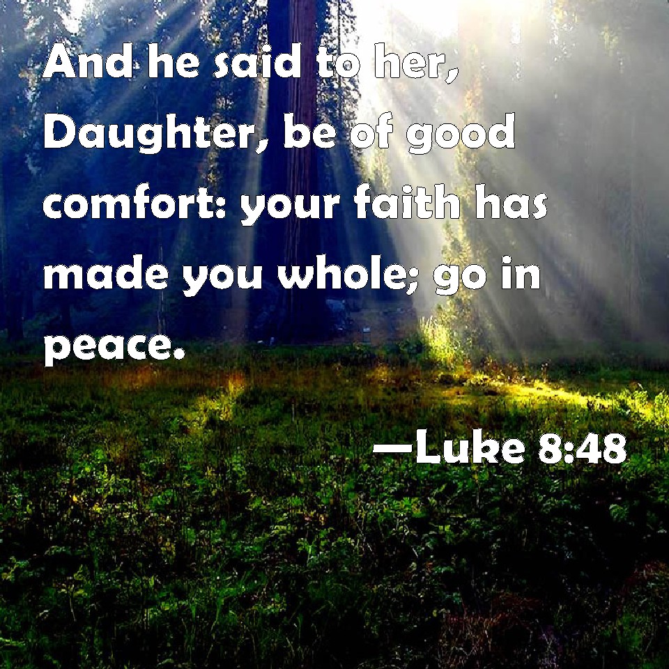 Choose a Background Luke 8:48 And he said to her, Daughter, be of good comfort: your faith has made you whole; go in peace. KJV: And he said unto her, Daughter, be of good comfort: thy faith hath made thee whole; go in peace. DRB: But he said to her: Daughter, thy faith hath made thee whole; go thy way in peace. DBT: And he said to her, Be of good courage, daughter; thy faith has healed thee; go in peace. ERV: And he said unto her, Daughter, thy faith hath made thee whole; go in peace. WBT: And he said to her, Daughter, be of good comfort: thy faith hath made thee whole; go in peace. WEB: He said to her, "Daughter, cheer up. Your faith has made you well. Go in peace." YLT: and he said to her, 'Take courage, daughter, thy faith hath saved thee, be going on to peace.'Links Luke 8:48 NIV • Luke 8:48 NLT • Luke 8:48 ESV • Luke 8:48 NASB • Luke 8:48 KJV • Luke 8:48 Interlinear • Luke 8:48 Commentaries • Luke 8:48 Parallel Texts • Luke 8:48 Bible Apps • Luke 8:48 Parallel • Bible Hub |