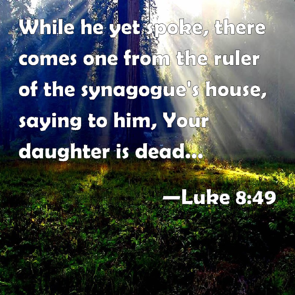 Choose a Background Luke 8:49 While he yet spoke, there comes one from the ruler of the synagogue's house, saying to him, Your daughter is dead; trouble not the Master. KJV: While he yet spake, there cometh one from the ruler of the synagogue's house, saying to him, Thy daughter is dead; trouble not the Master. DRB: As he was yet speaking, there cometh one to the ruler of the synagogue, saying to him: Thy daughter is dead, trouble him not. DBT: While he was yet speaking, comes some one from the ruler of the synagogue, saying to him, Thy daughter is dead; do not trouble the teacher. ERV: While he yet spake, there cometh one from the ruler of the synagogue's house, saying, Thy daughter is dead; trouble not the Master. WBT: While he was yet speaking, there cometh one from the house of the ruler of the synagogue, saying to him, Thy daughter is dead: trouble not the Master. WEB: While he still spoke, one from the ruler of the synagogue's house came, saying to him, "Your daughter is dead. Don't trouble the Teacher." YLT: While he is yet speaking, there doth come a certain one from the chief of the synagogue's house, saying to him — 'Thy daughter hath died, harass not the Teacher;'Links Luke 8:49 NIV • Luke 8:49 NLT • Luke 8:49 ESV • Luke 8:49 NASB • Luke 8:49 KJV • Luke 8:49 Interlinear • Luke 8:49 Commentaries • Luke 8:49 Parallel Texts • Luke 8:49 Bible Apps • Luke 8:49 Parallel • Bible Hub |