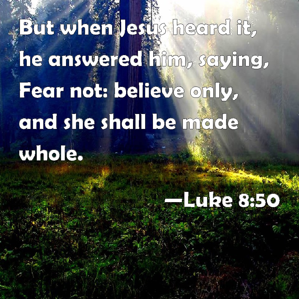 Choose a Background Luke 8:50 But when Jesus heard it, he answered him, saying, Fear not: believe only, and she shall be made whole. KJV: But when Jesus heard it, he answered him, saying, Fear not: believe only, and she shall be made whole. DRB: And Jesus hearing this word, answered the father of the maid: Fear not; believe only, and she shall be safe. DBT: But Jesus, hearing it, answered him saying, Fear not: only believe, and she shall be made well. ERV: But Jesus hearing it, answered him, Fear not: only believe, and she shall be made whole. WBT: But when Jesus heard it, he answered him, saying, Fear not: believe only, and she shall be healed. WEB: But Jesus hearing it, answered him, "Don't be afraid. Only believe, and she will be healed." YLT: and Jesus having heard, answered him, saying, 'Be not afraid, only believe, and she shall be saved.'Links Luke 8:50 NIV • Luke 8:50 NLT • Luke 8:50 ESV • Luke 8:50 NASB • Luke 8:50 KJV • Luke 8:50 Interlinear • Luke 8:50 Commentaries • Luke 8:50 Parallel Texts • Luke 8:50 Bible Apps • Luke 8:50 Parallel • Bible Hub |