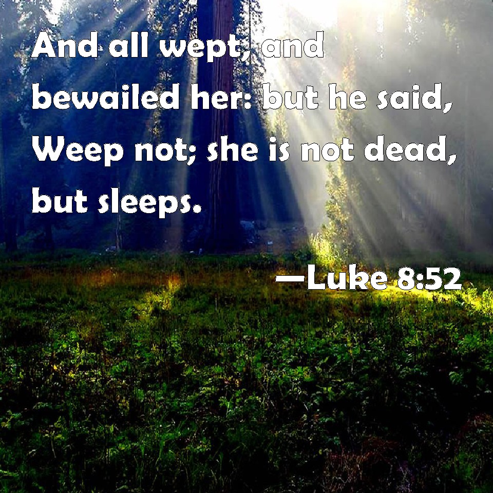 Choose a Background Luke 8:52 And all wept, and bewailed her: but he said, Weep not; she is not dead, but sleeps. KJV: And all wept, and bewailed her: but he said, Weep not; she is not dead, but sleepeth. DRB: And all wept and mourned for her. But he said: Weep not; the maid is not dead, but sleepeth. DBT: And all were weeping and lamenting her. But he said, Do not weep, for she has not died, but sleeps. ERV: And all were weeping, and bewailing her: but he said, Weep not; for she is not dead, but sleepeth. WBT: And all wept and bewailed her: but he said, Weep not: she is not dead, but sleepeth. WEB: All were weeping and mourning her, but he said, "Don't weep. She isn't dead, but sleeping." YLT: and they were all weeping, and beating themselves for her, and he said, 'Weep not, she did not die, but doth sleep;Links Luke 8:52 NIV • Luke 8:52 NLT • Luke 8:52 ESV • Luke 8:52 NASB • Luke 8:52 KJV • Luke 8:52 Interlinear • Luke 8:52 Commentaries • Luke 8:52 Parallel Texts • Luke 8:52 Bible Apps • Luke 8:52 Parallel • Bible Hub |