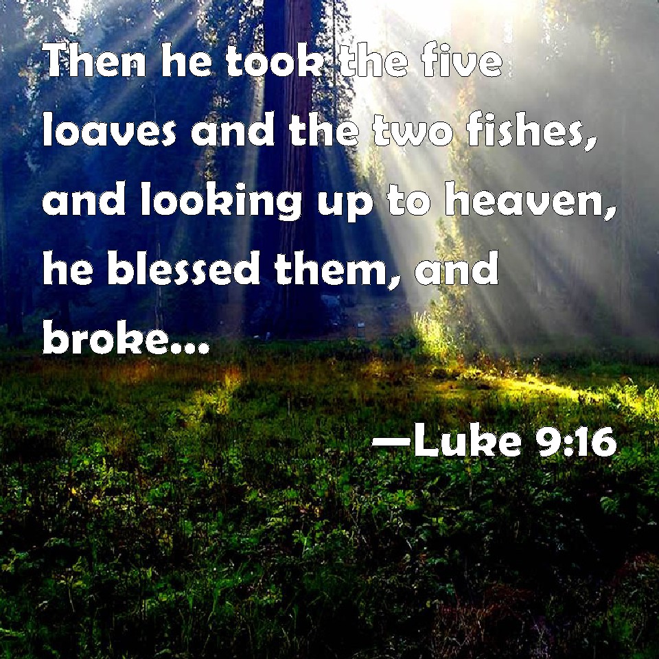 Choose a Background Luke 9:16 Then he took the five loaves and the two fishes, and looking up to heaven, he blessed them, and broke, and gave to the disciples to set before the multitude. KJV: Then he took the five loaves and the two fishes, and looking up to heaven, he blessed them, and brake, and gave to the disciples to set before the multitude. DRB: And taking the five loaves and the two fishes, he looked up to heaven, and blessed them; and he broke, and distributed to his disciples, to set before the multitude. DBT: And taking the five loaves and the two fishes, looking up to heaven he blessed them, and broke and gave to the disciples to set before the crowd. ERV: And he took the five loaves and the two fishes, and looking up to heaven, he blessed them, and brake; and gave to the disciples to set before the multitude. WBT: Then he took the five loaves, and the two fishes, and looking up to heaven, he blessed them, and broke, and gave to the disciples to set before the multitude. WEB: He took the five loaves and the two fish, and looking up to the sky, he blessed them, and broke them, and gave them to the disciples to set before the multitude. YLT: and having taken the five loaves, and the two fishes, having looked up to the heaven, he blessed them, and brake, and was giving to the disciples to set before the multitude;Links Luke 9:16 NIV • Luke 9:16 NLT • Luke 9:16 ESV • Luke 9:16 NASB • Luke 9:16 KJV • Luke 9:16 Interlinear • Luke 9:16 Commentaries • Luke 9:16 Parallel Texts • Luke 9:16 Bible Apps • Luke 9:16 Parallel • Bible Hub |