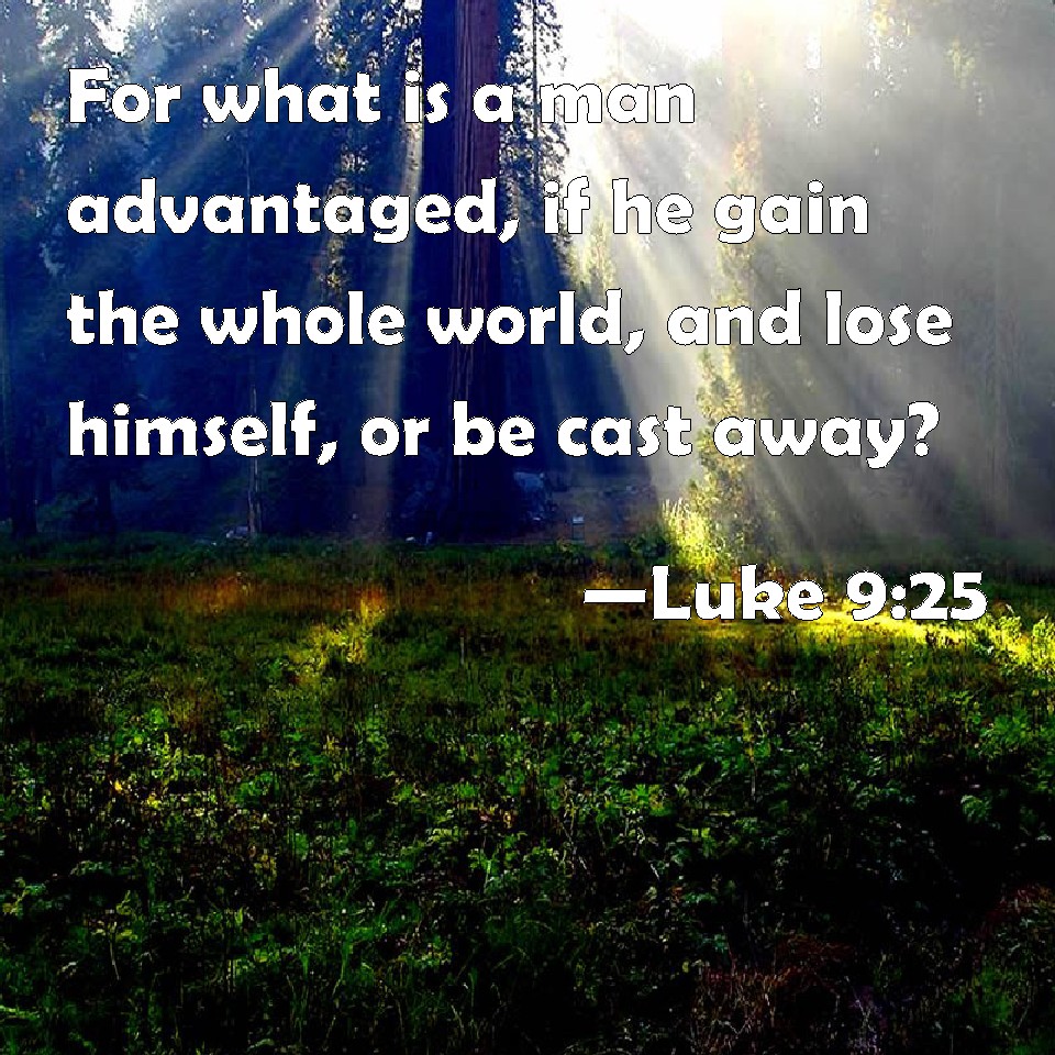 Choose a Background Luke 9:25 For what is a man advantaged, if he gain the whole world, and lose himself, or be cast away? KJV: For what is a man advantaged, if he gain the whole world, and lose himself, or be cast away? DRB: For what is a man advantaged, if he gain the whole world, and lose himself, and cast away himself? DBT: For what shall a man profit if he shall have gained the whole world, and have destroyed, or come under the penalty of the loss of himself? ERV: For what is a man profited, if he gain the whole world, and lose or forfeit his own self? WBT: For what is a man profited, if he shall gain the whole world, and lose himself, or be cast away? WEB: For what does it profit a man if he gains the whole world, and loses or forfeits his own self? YLT: for what is a man profited, having gained the whole world, and having lost or having forfeited himself?Links Luke 9:25 NIV • Luke 9:25 NLT • Luke 9:25 ESV • Luke 9:25 NASB • Luke 9:25 KJV • Luke 9:25 Interlinear • Luke 9:25 Commentaries • Luke 9:25 Parallel Texts • Luke 9:25 Bible Apps • Luke 9:25 Parallel • Bible Hub |