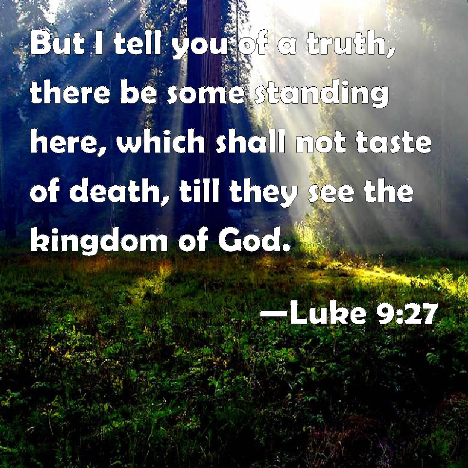 Choose a Background Luke 9:27 But I tell you of a truth, there be some standing here, which shall not taste of death, till they see the kingdom of God. KJV: But I tell you of a truth, there be some standing here, which shall not taste of death, till they see the kingdom of God. DRB: But I tell you of a truth: There are some standing here that shall not taste death, till they see the kingdom of God. DBT: But I say unto you of a truth, There are some of those standing here who shall not taste death until they shall have seen the kingdom of God. ERV: But I tell you of a truth, There be some of them that stand here, which shall in no wise taste of death, till they see the kingdom of God. WBT: But I tell you in truth, there are some standing here who shall not taste death till they see the kingdom of God. WEB: But I tell you the truth: There are some of those who stand here, who will in no way taste of death, until they see the Kingdom of God." YLT: and I say to you, truly, there are certain of those here standing, who shall not taste of death till they may see the reign of God.'Links Luke 9:27 NIV • Luke 9:27 NLT • Luke 9:27 ESV • Luke 9:27 NASB • Luke 9:27 KJV • Luke 9:27 Interlinear • Luke 9:27 Commentaries • Luke 9:27 Parallel Texts • Luke 9:27 Bible Apps • Luke 9:27 Parallel • Bible Hub |