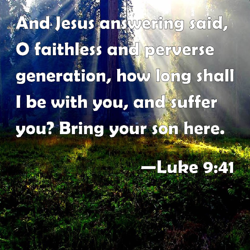 Choose a Background Luke 9:41 And Jesus answering said, O faithless and perverse generation, how long shall I be with you, and suffer you? Bring your son here. KJV: And Jesus answering said, O faithless and perverse generation, how long shall I be with you, and suffer you? Bring thy son hither. DRB: And Jesus answering, said: O faithless and perverse generation, how long shall I be with you, and suffer you? Bring hither thy son. DBT: And Jesus answering said, O unbelieving and perverted generation, how long shall I be with you and suffer you? Bring hither thy son. ERV: And Jesus answered and said, O faithless and perverse generation, how long shall I be with you, and bear with you? bring hither thy son. WBT: And Jesus answering, said, O faithless and perverse generation, how long shall I be with you, and suffer you? Bring thy son hither. WEB: Jesus answered, "Faithless and perverse generation, how long shall I be with you and bear with you? Bring your son here." YLT: And Jesus answering said, 'O generation, unstedfast and perverse, till when shall I be with you, and suffer you? bring near hither thy son;'Links Luke 9:41 NIV • Luke 9:41 NLT • Luke 9:41 ESV • Luke 9:41 NASB • Luke 9:41 KJV • Luke 9:41 Interlinear • Luke 9:41 Commentaries • Luke 9:41 Parallel Texts • Luke 9:41 Bible Apps • Luke 9:41 Parallel • Bible Hub |