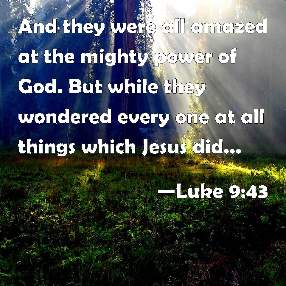 Choose a Background Luke 9:43 And they were all amazed at the mighty power of God. But while they wondered every one at all things which Jesus did, he said to his disciples, KJV: And they were all amazed at the mighty power of God. But while they wondered every one at all things which Jesus did, he said unto his disciples, DRB: And Jesus rebuked the unclean spirit, and cured the boy, and restored him to his father. DBT: And all were astonished at the glorious greatness of God. And as all wondered at all the things which Jesus did, he said to his disciples, ERV: And they were all astonished at the majesty of God. But while all were marveling at all the things which he did, he said unto his disciples, WBT: And they were all amazed at the mighty power of God. But while they were all wondering at all things which Jesus did, he said to his disciples, WEB: They were all astonished at the majesty of God. But while all were marveling at all the things which Jesus did, he said to his disciples, YLT: And they were all amazed at the greatness of God, and while all are wondering at all things that Jesus did, he said unto his disciples,Links Luke 9:43 NIV • Luke 9:43 NLT • Luke 9:43 ESV • Luke 9:43 NASB • Luke 9:43 KJV • Luke 9:43 Interlinear • Luke 9:43 Commentaries • Luke 9:43 Parallel Texts • Luke 9:43 Bible Apps • Luke 9:43 Parallel • Bible Hub |
