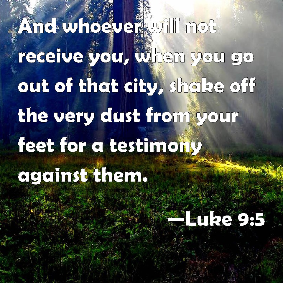 Choose a Background Luke 9:5 And whoever will not receive you, when you go out of that city, shake off the very dust from your feet for a testimony against them. KJV: And whosoever will not receive you, when ye go out of that city, shake off the very dust from your feet for a testimony against them. DRB: And whosoever will not receive you, when ye go out of that city, shake off even the dust of your feet, for a testimony against them. DBT: And as many as may not receive you, going forth from that city, shake off even the dust from your feet for a witness against them. ERV: And as many as receive you not, when ye depart from that city, shake off the dust from your feet for a testimony against them. WBT: And whoever will not receive you, when ye go out of that city, shake off the very dust from your feet for a testimony against them. WEB: As many as don't receive you, when you depart from that city, shake off even the dust from your feet for a testimony against them." YLT: and as many as may not receive you, going forth from that city, even the dust from your feet shake off, for a testimony against them.'Links Luke 9:5 NIV • Luke 9:5 NLT • Luke 9:5 ESV • Luke 9:5 NASB • Luke 9:5 KJV • Luke 9:5 Interlinear • Luke 9:5 Commentaries • Luke 9:5 Parallel Texts • Luke 9:5 Bible Apps • Luke 9:5 Parallel • Bible Hub |