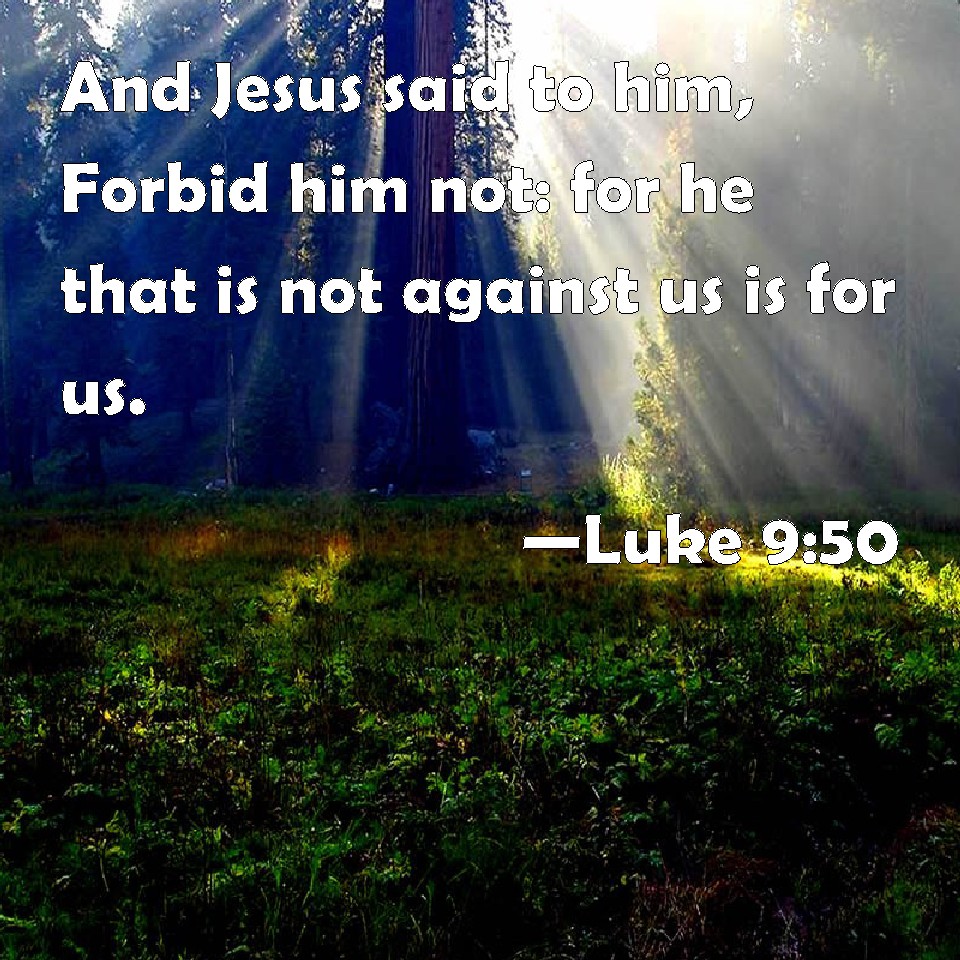 Choose a Background Luke 9:50 And Jesus said to him, Forbid him not: for he that is not against us is for us. KJV: And Jesus said unto him, Forbid him not: for he that is not against us is for us. DRB: And Jesus said to him: Forbid him not; for he that is not against you, is for you. DBT: And Jesus said to him, Forbid him not, for he that is not against you is for you. ERV: But Jesus said unto him, Forbid him not: for he that is not against you is for you. WBT: And Jesus said to him, Forbid him not: for he that is not against us, is for us. WEB: Jesus said to him, "Don't forbid him, for he who is not against us is for us." YLT: and Jesus said unto him, 'Forbid not, for he who is not against us, is for us.'Links Luke 9:50 NIV • Luke 9:50 NLT • Luke 9:50 ESV • Luke 9:50 NASB • Luke 9:50 KJV • Luke 9:50 Interlinear • Luke 9:50 Commentaries • Luke 9:50 Parallel Texts • Luke 9:50 Bible Apps • Luke 9:50 Parallel • Bible Hub |