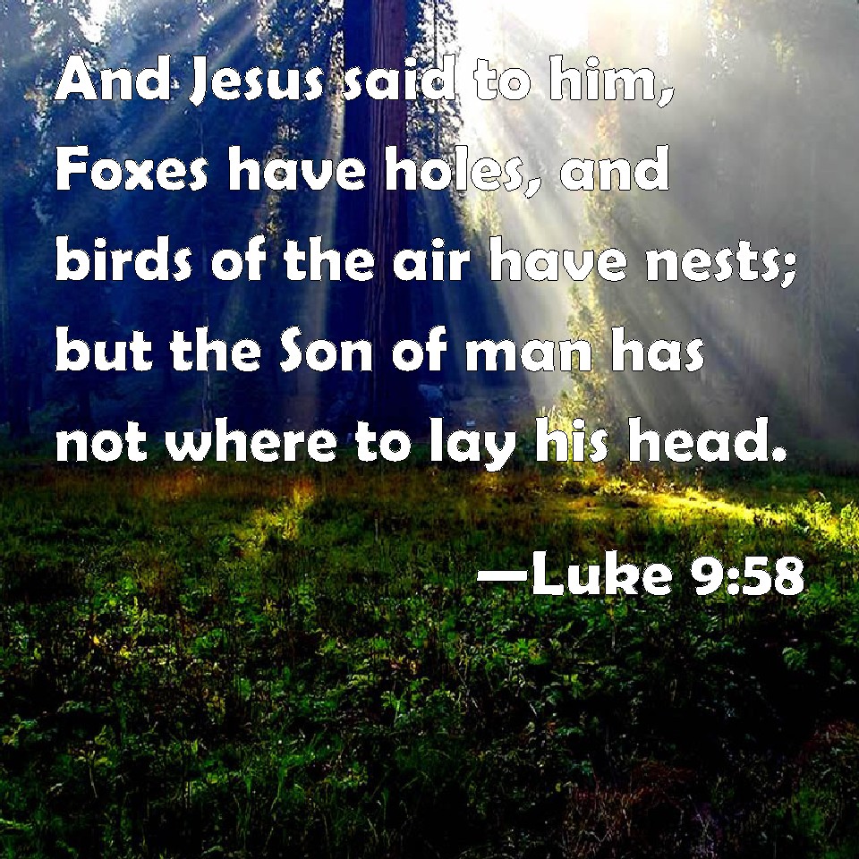 Choose a Background Luke 9:58 And Jesus said to him, Foxes have holes, and birds of the air have nests; but the Son of man has not where to lay his head. KJV: And Jesus said unto him, Foxes have holes, and birds of the air have nests; but the Son of man hath not where to lay his head. DRB: Jesus said to him: The foxes have holes, and the birds of the air nests; but the Son of man hath not where to lay his head. DBT: And Jesus said to him, The foxes have holes and the birds of the heaven roosting-places, but the Son of man has not where he may lay his head. ERV: And Jesus said unto him, The foxes have holes, and the birds of the heaven have nests; but the Son of man hath not where to lay his head. WBT: And Jesus said to him, Foxes have holes, and birds of the air have nests; but the Son of man hath not where to lay his head. WEB: Jesus said to him, "The foxes have holes, and the birds of the sky have nests, but the Son of Man has no place to lay his head." YLT: and Jesus said to him, 'The foxes have holes, and the fowls of the heaven places of rest, but the Son of Man hath not where he may recline the head.'Links Luke 9:58 NIV • Luke 9:58 NLT • Luke 9:58 ESV • Luke 9:58 NASB • Luke 9:58 KJV • Luke 9:58 Interlinear • Luke 9:58 Commentaries • Luke 9:58 Parallel Texts • Luke 9:58 Bible Apps • Luke 9:58 Parallel • Bible Hub |