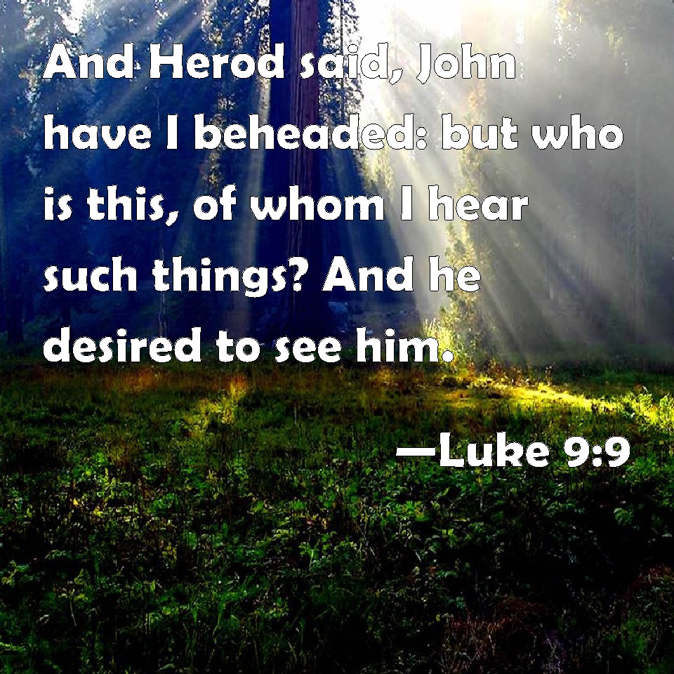 Choose a Background Luke 9:9 And Herod said, John have I beheaded: but who is this, of whom I hear such things? And he desired to see him. KJV: And Herod said, John have I beheaded: but who is this, of whom I hear such things? And he desired to see him. DRB: And Herod said: John I have beheaded; but who is this of whom I hear such things? And he sought to see him. DBT: And Herod said, John I have beheaded, but who is this of whom I hear such things? and he sought to see him. ERV: And Herod said, John I beheaded: but who is this, about whom I hear such things? And he sought to see him. WBT: And Herod said, John have I beheaded; but who is this of whom I hear such things? And he desired to see him. WEB: Herod said, "John I beheaded, but who is this, about whom I hear such things?" He sought to see him. YLT: and Herod said, 'John I did behead, but who is this concerning whom I hear such things?' and he was seeking to see him.Links Luke 9:9 NIV • Luke 9:9 NLT • Luke 9:9 ESV • Luke 9:9 NASB • Luke 9:9 KJV • Luke 9:9 Interlinear • Luke 9:9 Commentaries • Luke 9:9 Parallel Texts • Luke 9:9 Bible Apps • Luke 9:9 Parallel • Bible Hub |