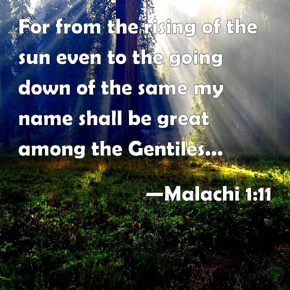 Choose a Background Malachi 1:11 For from the rising of the sun even to the going down of the same my name shall be great among the Gentiles; and in every place incense shall be offered to my name, and a pure offering: for my name shall be great among the heathen, said the LORD of hosts. KJV: For from the rising of the sun even unto the going down of the same my name shall be great among the Gentiles; and in every place incense shall be offered unto my name, and a pure offering: for my name shall be great among the heathen, saith the LORD of hosts. DRB: For from the rising of the sun even to the going down, my name is great among the Gentiles, and in every place there is sacrifice, and there is offered to my name a clean oblation: for my name is great among the Gentiles, saith the Lord of hosts. DBT: For from the rising of the sun even unto its setting my name shall be great among the nations; and in every place incense shall be offered unto my name, and a pure oblation: for my name shall be great among the nations, saith Jehovah of hosts. ERV: For from the rising of the sun even unto the going down of the same my name is great among the Gentiles; and in every place incense is offered unto my name, and a pure offering: for my name is great among the Gentiles, saith the LORD of hosts. WBT: For from the rising of the sun even to the setting of the same, my name shall be great among the Gentiles; and in every place incense shall be offered to my name, and a pure offering: for my name shall be great among the heathen, saith the LORD of hosts. WEB: For from the rising of the sun even to the going down of the same, my name is great among the nations, and in every place incense will be offered to my name, and a pure offering: for my name is great among the nations," says Yahweh of Armies. YLT: For, from the rising of the sun to its going in, Great is My name among nations, And in every place perfume is brought nigh to My name, and a pure present, For great is My name among nations, Said Jehovah of Hosts.Links Malachi 1:11 NIV • Malachi 1:11 NLT • Malachi 1:11 ESV • Malachi 1:11 NASB • Malachi 1:11 KJV • Malachi 1:11 Interlinear • Malachi 1:11 Commentaries • Malachi 1:11 Parallel Texts • Malachi 1:11 Bible Apps • Malachi 1:11 Parallel • Bible Hub |