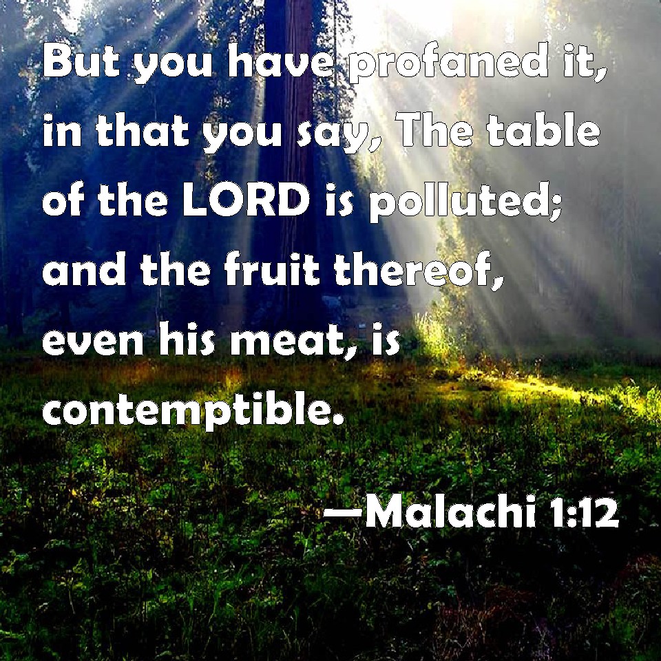 Choose a Background Malachi 1:12 But you have profaned it, in that you say, The table of the LORD is polluted; and the fruit thereof, even his meat, is contemptible. KJV: But ye have profaned it, in that ye say, The table of the LORD is polluted; and the fruit thereof, even his meat, is contemptible. DRB: And you have profaned it in that you say: The table of the Lord is defiled: and that which is laid thereupon is contemptible with the fire that devoureth it. DBT: But ye profane it, in that ye say, The table of the Lord is polluted; and the fruit thereof, his food, is contemptible. ERV: But ye profane it, in that ye say, The table of the LORD is polluted, and the fruit thereof, even his meat, is contemptible. WBT: But ye have profaned it, in that ye say, The table of the LORD is polluted; and the fruit of it, even his provision, is contemptible. WEB: "But you profane it, in that you say, 'Yahweh's table is polluted, and its fruit, even its food, is contemptible.' YLT: And ye are polluting it in your saying, 'The table of Jehovah — it is polluted, As to its fruit — despicable is its food.'Links Malachi 1:12 NIV • Malachi 1:12 NLT • Malachi 1:12 ESV • Malachi 1:12 NASB • Malachi 1:12 KJV • Malachi 1:12 Interlinear • Malachi 1:12 Commentaries • Malachi 1:12 Parallel Texts • Malachi 1:12 Bible Apps • Malachi 1:12 Parallel • Bible Hub |