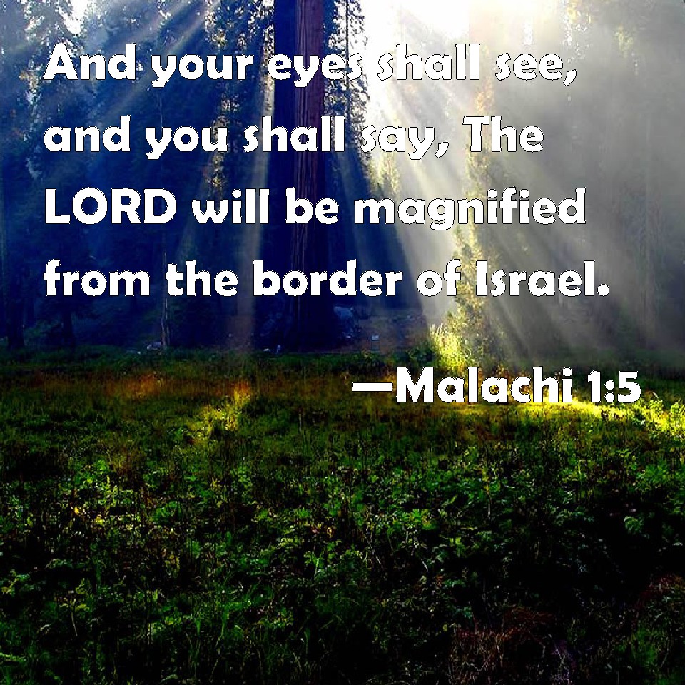 Choose a Background Malachi 1:5 And your eyes shall see, and you shall say, The LORD will be magnified from the border of Israel. KJV: And your eyes shall see, and ye shall say, The LORD will be magnified from the border of Israel. DRB: And your eyes shall see, and you shall say: The Lord be magnified upon the border of Israel. DBT: And your eyes shall see it, and ye shall say, Jehovah is magnified beyond the border of Israel. ERV: And your eyes shall see, and ye shall say, The LORD be magnified beyond the border of Israel. WBT: And your eyes shall see, and ye shall say, The LORD will be magnified from the border of Israel. WEB: Your eyes will see, and you will say, "Yahweh is great—even beyond the border of Israel!" YLT: And your eyes do see, and ye say, 'Magnified is Jehovah beyond the border of Israel,Links Malachi 1:5 NIV • Malachi 1:5 NLT • Malachi 1:5 ESV • Malachi 1:5 NASB • Malachi 1:5 KJV • Malachi 1:5 Interlinear • Malachi 1:5 Commentaries • Malachi 1:5 Parallel Texts • Malachi 1:5 Bible Apps • Malachi 1:5 Parallel • Bible Hub |