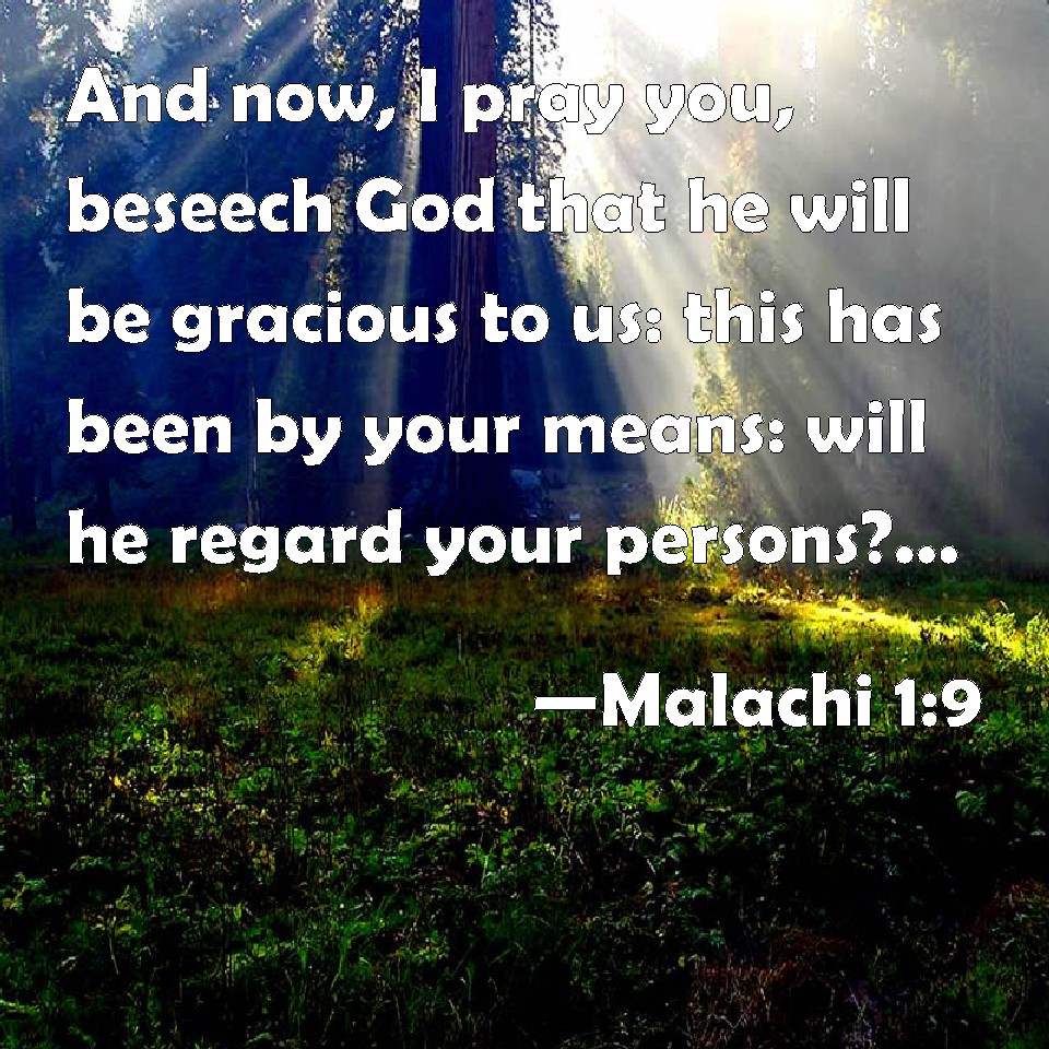Choose a Background Malachi 1:9 And now, I pray you, beseech God that he will be gracious to us: this has been by your means: will he regard your persons? said the LORD of hosts. KJV: And now, I pray you, beseech God that he will be gracious unto us: this hath been by your means: will he regard your persons? saith the LORD of hosts. DRB: And now beseech ye the face of God, that he may have mercy on you, (for by your hand hath this been done,) if by any means he will receive your faces, saith the Lord of hosts. DBT: And now, I pray you, beseech God that he will be gracious unto us. This hath been of your hand: will he accept any of your persons? saith Jehovah of hosts. ERV: And now, I pray you, entreat the favour of God, that he may be gracious unto us: this hath been by your means: will he accept any of your persons? saith the LORD of hosts. WBT: And now, I pray you, beseech God that he will be gracious to us: this hath been by your means: will he regard your person? saith the LORD of hosts. WEB: "Now, please entreat the favor of God, that he may be gracious to us. With this, will he accept any of you?" says Yahweh of Armies. YLT: And now, appease, I pray thee, the face of God, And He doth favour us; From your own hand hath this been, Doth He accept of you appearances? Said Jehovah of Hosts.Links Malachi 1:9 NIV • Malachi 1:9 NLT • Malachi 1:9 ESV • Malachi 1:9 NASB • Malachi 1:9 KJV • Malachi 1:9 Interlinear • Malachi 1:9 Commentaries • Malachi 1:9 Parallel Texts • Malachi 1:9 Bible Apps • Malachi 1:9 Parallel • Bible Hub |