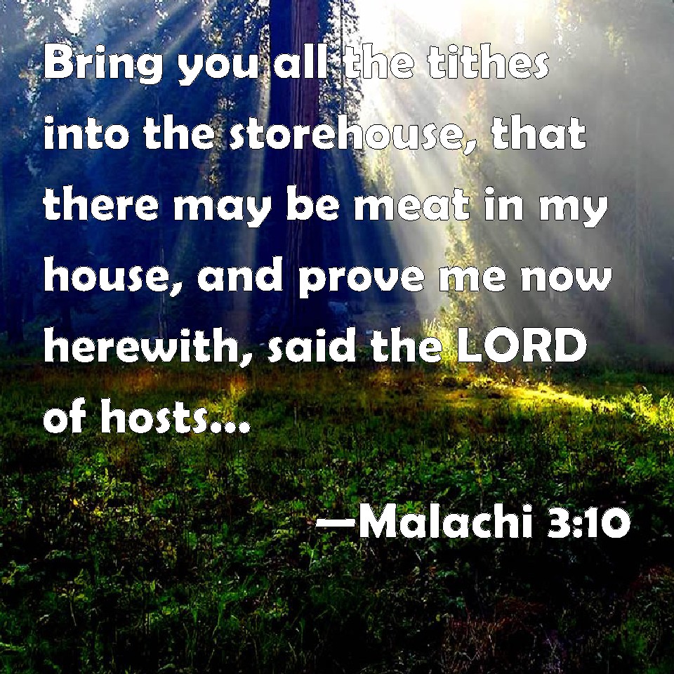 Choose a Background Malachi 3:10 Bring you all the tithes into the storehouse, that there may be meat in my house, and prove me now herewith, said the LORD of hosts, if I will not open you the windows of heaven, and pour you out a blessing, that there shall not be room enough to receive it. KJV: Bring ye all the tithes into the storehouse, that there may be meat in mine house, and prove me now herewith, saith the LORD of hosts, if I will not open you the windows of heaven, and pour you out a blessing, that there shall not be room enough to receive it. DRB: Bring all the tithes into the storehouse, that there may be meat in my house, and try me in this, saith the Lord: if I open not unto you the flood-gates of heaven, and pour you out a blessing even to abundance. DBT: Bring the whole tithe into the treasure-house, that there may be food in my house, and prove me now herewith, saith Jehovah of hosts, if I open not to you the windows of the heavens, and pour you out a blessing, till there be no place for it. ERV: Bring ye the whole tithe into the storehouse, that there may be meat in mine house, and prove me now herewith, saith the LORD of hosts, if I will not open you the windows of heaven, and pour you out a blessing, that there shall not be room enough to receive it. WBT: Bring ye all the tithes into the store-house, that there may be food in my house, and prove me now with this, saith the LORD of hosts, if I will not open you the windows of heaven, and pour you out a blessing, that there shall not be room enough to receive it. WEB: Bring the whole tithe into the storehouse, that there may be food in my house, and test me now in this," says Yahweh of Armies, "if I will not open you the windows of heaven, and pour you out a blessing, that there shall not be room enough for. YLT: Bring in all the tithe unto the treasure-house, And there is food in My house; When ye have tried Me, now, with this, Said Jehovah of Hosts, Do not I open to you the windows of heaven? Yea, I have emptied on you a blessing till there is no space.Links Malachi 3:10 NIV • Malachi 3:10 NLT • Malachi 3:10 ESV • Malachi 3:10 NASB • Malachi 3:10 KJV • Malachi 3:10 Interlinear • Malachi 3:10 Commentaries • Malachi 3:10 Parallel Texts • Malachi 3:10 Bible Apps • Malachi 3:10 Parallel • Bible Hub |