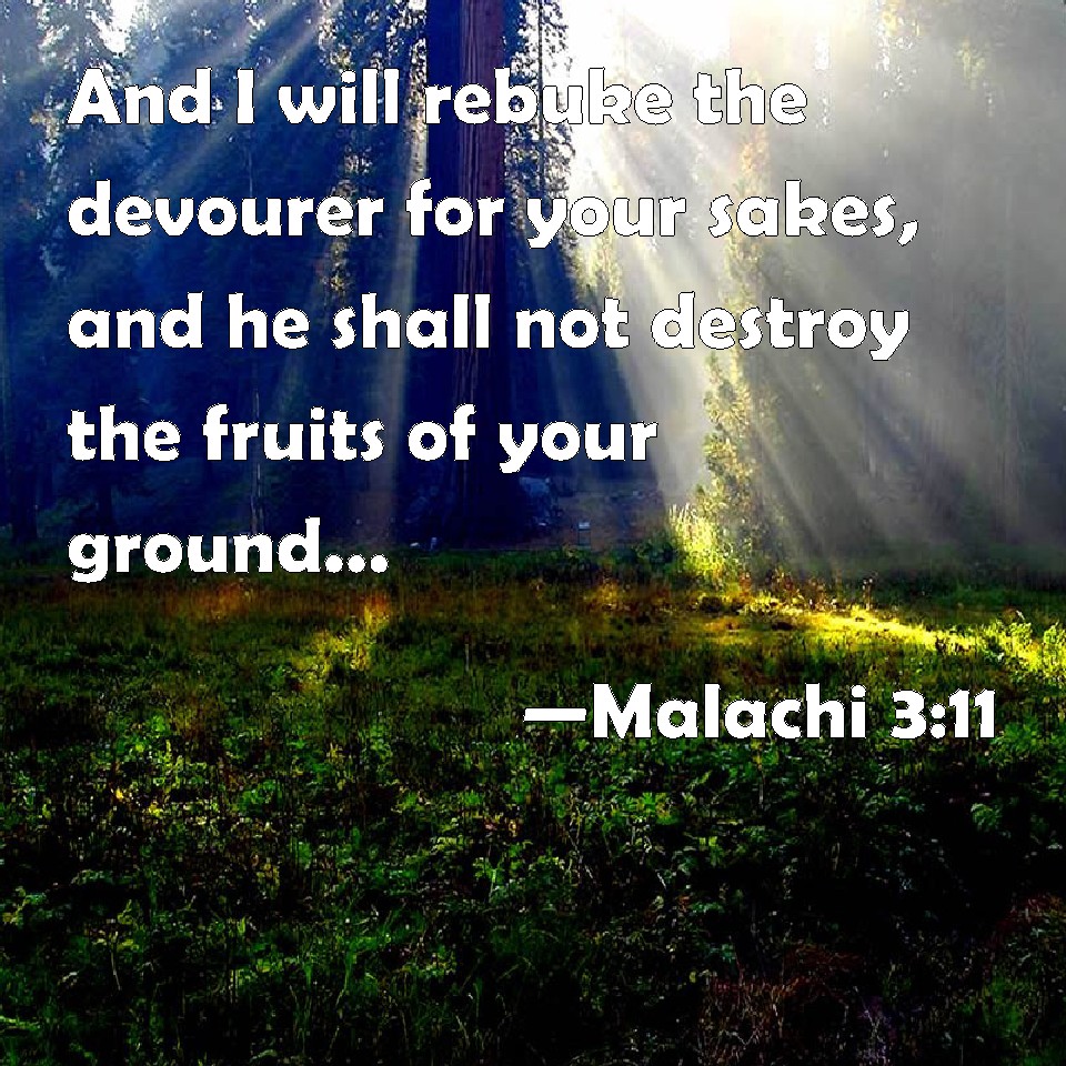 Choose a Background Malachi 3:11 And I will rebuke the devourer for your sakes, and he shall not destroy the fruits of your ground; neither shall your vine cast her fruit before the time in the field, said the LORD of hosts. KJV: And I will rebuke the devourer for your sakes, and he shall not destroy the fruits of your ground; neither shall your vine cast her fruit before the time in the field, saith the LORD of hosts. DRB: And I will rebuke for your sakes the devourer, and he shall not spoil the fruit of your land: neither shall the vine in the field be barren, saith the Lord of hosts. DBT: And I will rebuke the devourer for your sakes, and he shall not destroy the fruits of your ground; neither shall your vine cast its fruit before the time in the field, saith Jehovah of hosts. ERV: And I will rebuke the devourer for your sakes, and he shall not destroy the fruits of your ground; neither shall your vine cast her fruit before the time in the field, saith the LORD of hosts. WBT: And I will rebuke the devourer for your sakes, and he shall not destroy the fruits of your ground; neither shall your vine cast her fruit before the time in the field, saith the LORD of hosts. WEB: I will rebuke the devourer for your sakes, and he shall not destroy the fruits of your ground; neither shall your vine cast its fruit before its time in the field," says Yahweh of Armies. YLT: And I have pushed for you against the consumer, And He doth not destroy to you the fruit of the ground, Nor miscarry to you doth the vine in the field, Said Jehovah of Hosts.Links Malachi 3:11 NIV • Malachi 3:11 NLT • Malachi 3:11 ESV • Malachi 3:11 NASB • Malachi 3:11 KJV • Malachi 3:11 Interlinear • Malachi 3:11 Commentaries • Malachi 3:11 Parallel Texts • Malachi 3:11 Bible Apps • Malachi 3:11 Parallel • Bible Hub |