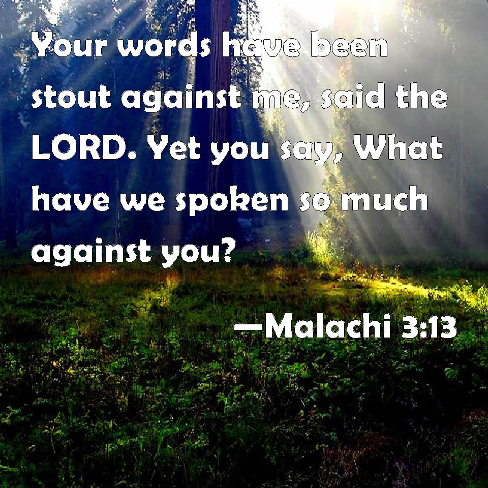 Choose a Background Malachi 3:13 Your words have been stout against me, said the LORD. Yet you say, What have we spoken so much against you? KJV: Your words have been stout against me, saith the LORD. Yet ye say, What have we spoken so much against thee? DRB: Your words have been unsufferable to me, saith the Lord. DBT: Your words have been stout against me, saith Jehovah; but ye say, What have we been speaking against thee? ERV: Your words have been stout against me, saith the LORD. Yet ye say, Wherein have we spoken against thee? WBT: Your words have been stout against me, saith the LORD. Yet ye say, What have we spoken so much against thee? WEB: "Your words have been stout against me," says Yahweh. "Yet you say, 'What have we spoken against you?' YLT: Hard against Me have been your words, Said Jehovah, and ye have said: 'What have we spoken against Thee?'Links Malachi 3:13 NIV • Malachi 3:13 NLT • Malachi 3:13 ESV • Malachi 3:13 NASB • Malachi 3:13 KJV • Malachi 3:13 Interlinear • Malachi 3:13 Commentaries • Malachi 3:13 Parallel Texts • Malachi 3:13 Bible Apps • Malachi 3:13 Parallel • Bible Hub |