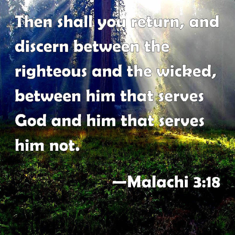 Choose a Background Malachi 3:18 Then shall you return, and discern between the righteous and the wicked, between him that serves God and him that serves him not. KJV: Then shall ye return, and discern between the righteous and the wicked, between him that serveth God and him that serveth him not. DRB: And you shall return, and shall see the difference between the just and the wicked: and between him that serveth God, and him that serveth him not. DBT: And ye shall return and discern between the righteous and the wicked, between him that serveth God and him that serveth him not. ERV: Then shall ye return and discern between the righteous and the wicked, between him that serveth God and him that serveth him not. WBT: Then shall ye return and discern between the righteous and the wicked, between him that serveth God and him that serveth him not. WEB: Then you shall return and discern between the righteous and the wicked, between him who serves God and him who doesn't serve him. YLT: And ye have turned back and considered, Between the righteous and the wicked, Between the servant of God and him who is not His servant.Links Malachi 3:18 NIV • Malachi 3:18 NLT • Malachi 3:18 ESV • Malachi 3:18 NASB • Malachi 3:18 KJV • Malachi 3:18 Interlinear • Malachi 3:18 Commentaries • Malachi 3:18 Parallel Texts • Malachi 3:18 Bible Apps • Malachi 3:18 Parallel • Bible Hub |