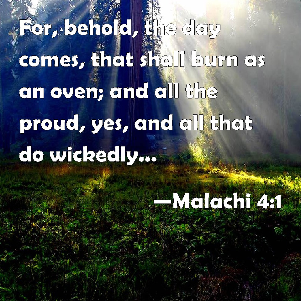 Choose a Background Malachi 4:1 For, behold, the day comes, that shall burn as an oven; and all the proud, yes, and all that do wickedly, shall be stubble: and the day that comes shall burn them up, said the LORD of hosts, that it shall leave them neither root nor branch. KJV: For, behold, the day cometh, that shall burn as an oven; and all the proud, yea, and all that do wickedly, shall be stubble: and the day that cometh shall burn them up, saith the LORD of hosts, that it shall leave them neither root nor branch. DRB: For behold the day shall come kindled as a furnace: and all the proud, and all that do wickedly shall be stubble: and the day that cometh shall set them on fire, saith the Lord of hosts, it shall not leave them root, nor branch. DBT: For behold, the day cometh, burning as a furnace; and all the proud and all that work wickedness shall be stubble; and the day that cometh shall burn them up, saith Jehovah of hosts, so that it shall leave them neither root nor branch. ERV: For, behold, the day cometh, it burneth as a furnace; and all the proud, and all that work wickedness, shall be stubble: and the day that cometh shall burn them up, saith the LORD of hosts, that it shall leave them neither root nor branch. WBT: For behold, the day cometh, that shall burn as an oven; and all the proud, and all that do wickedly, shall be stubble: and the day that cometh shall burn them up, saith the LORD of hosts, that it shall leave them neither root nor branch. WEB: "For, behold, the day comes, it burns as a furnace; and all the proud, and all who work wickedness, will be stubble; and the day that comes will burn them up," says Yahweh of Armies, "that it shall leave them neither root nor branch. YLT: For, lo, the day hath come, burning as a furnace, And all the proud, and every wicked doer, have been stubble, And burnt them hath the day that came, Said Jehovah of Hosts, That there is not left to them root or branch,Links Malachi 4:1 NIV • Malachi 4:1 NLT • Malachi 4:1 ESV • Malachi 4:1 NASB • Malachi 4:1 KJV • Malachi 4:1 Interlinear • Malachi 4:1 Commentaries • Malachi 4:1 Parallel Texts • Malachi 4:1 Bible Apps • Malachi 4:1 Parallel • Bible Hub |