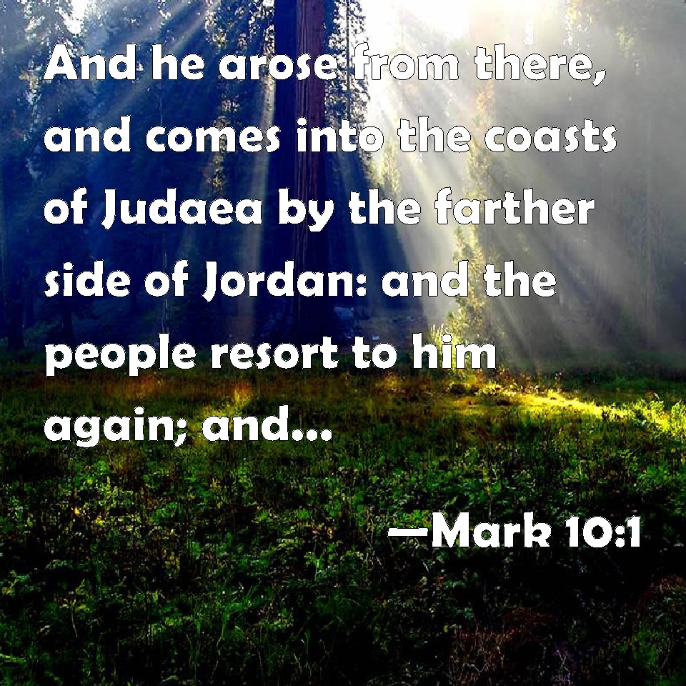 Choose a Background Mark 10:1 And he arose from there, and comes into the coasts of Judaea by the farther side of Jordan: and the people resort to him again; and, as he was wont, he taught them again. KJV: And he arose from thence, and cometh into the coasts of Judaea by the farther side of Jordan: and the people resort unto him again; and, as he was wont, he taught them again. DRB: AND rising up from thence, he cometh into the coasts of Judea beyond the Jordan: and the multitudes flock to him again. And as he was accustomed, he taught them again. DBT: And rising up thence he comes into the coasts of Judaea, and the other side of the Jordan. And again crowds come together to him, and, as he was accustomed, again he taught them. ERV: And he arose from thence, and cometh into the borders of Judaea and beyond Jordan: and multitudes come together unto him again; and, as he was wont, he taught them again. WBT: And he arose from thence, and cometh into the borders of Judea, by the further side of Jordan: and the people resort to him again; and, as he was accustomed, he taught them again. WEB: He arose from there and came into the borders of Judea and beyond the Jordan. Multitudes came together to him again. As he usually did, he was again teaching them. YLT: And having risen thence, he doth come to the coasts of Judea, through the other side of the Jordan, and again do multitudes come together unto him, and, as he had been accustomed, again he was teaching them.Links Mark 10:1 NIV • Mark 10:1 NLT • Mark 10:1 ESV • Mark 10:1 NASB • Mark 10:1 KJV • Mark 10:1 Interlinear • Mark 10:1 Commentaries • Mark 10:1 Parallel Texts • Mark 10:1 Bible Apps • Mark 10:1 Parallel • Bible Hub |