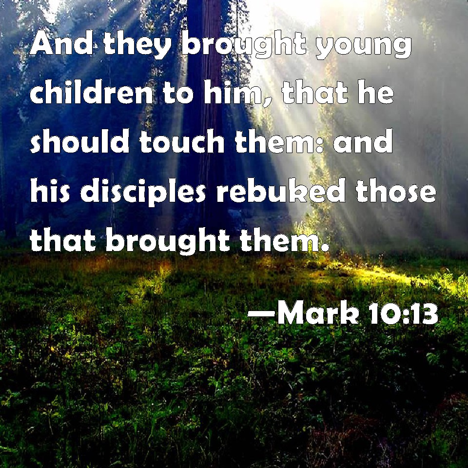Choose a Background Mark 10:13 And they brought young children to him, that he should touch them: and his disciples rebuked those that brought them. KJV: And they brought young children to him, that he should touch them: and his disciples rebuked those that brought them. DRB: And they brought to him young children, that he might touch them. And the disciples rebuked them that brought them. DBT: And they brought little children to him that he might touch them. But the disciples rebuked those that brought them. ERV: And they brought unto him little children, that he should touch them: and the disciples rebuked them. WBT: And they brought young children to him, that he should touch them; and his disciples rebuked those that brought them. WEB: They were bringing to him little children, that he should touch them, but the disciples rebuked those who were bringing them. YLT: And they were bringing to him children, that he might touch them, and the disciples were rebuking those bringing them,Links Mark 10:13 NIV • Mark 10:13 NLT • Mark 10:13 ESV • Mark 10:13 NASB • Mark 10:13 KJV • Mark 10:13 Interlinear • Mark 10:13 Commentaries • Mark 10:13 Parallel Texts • Mark 10:13 Bible Apps • Mark 10:13 Parallel • Bible Hub |