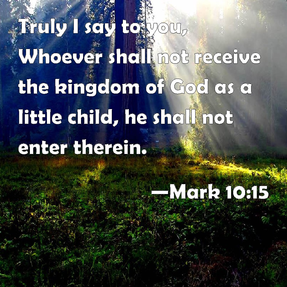 Choose a Background Mark 10:15 Truly I say to you, Whoever shall not receive the kingdom of God as a little child, he shall not enter therein. KJV: Verily I say unto you, Whosoever shall not receive the kingdom of God as a little child, he shall not enter therein. DRB: Amen I say to you, whosoever shall not receive the kingdom of God as a little child, shall not enter into it. DBT: Verily I say to you, Whosoever shall not receive the kingdom of God as a little child, shall in no wise enter into it. ERV: Verily I say unto you, Whosoever shall not receive the kingdom of God as a little child, he shall in no wise enter therein. WBT: Verily I say to you, Whoever shall not receive the kingdom of God, as a little child, he shall not enter it. WEB: Most certainly I tell you, whoever will not receive the Kingdom of God like a little child, he will in no way enter into it." YLT: verily I say to you, whoever may not receive the reign of God, as a child — he may not enter into it;'Links Mark 10:15 NIV • Mark 10:15 NLT • Mark 10:15 ESV • Mark 10:15 NASB • Mark 10:15 KJV • Mark 10:15 Interlinear • Mark 10:15 Commentaries • Mark 10:15 Parallel Texts • Mark 10:15 Bible Apps • Mark 10:15 Parallel • Bible Hub |