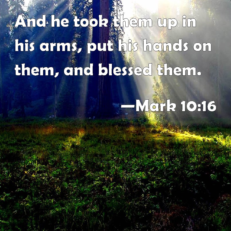 Choose a Background Mark 10:16 And he took them up in his arms, put his hands on them, and blessed them. KJV: And he took them up in his arms, put his hands upon them, and blessed them. DRB: And embracing them, and laying his hands upon them, he blessed them. DBT: And having taken them in his arms, having laid his hands on them, he blessed them. ERV: And he took them in his arms, and blessed them, laying his hands upon them. WBT: And he took them up in his arms, put his hands upon them, and blessed them. WEB: He took them in his arms, and blessed them, laying his hands on them. YLT: and having taken them in his arms, having put his hands upon them, he was blessing them.Links Mark 10:16 NIV • Mark 10:16 NLT • Mark 10:16 ESV • Mark 10:16 NASB • Mark 10:16 KJV • Mark 10:16 Interlinear • Mark 10:16 Commentaries • Mark 10:16 Parallel Texts • Mark 10:16 Bible Apps • Mark 10:16 Parallel • Bible Hub |