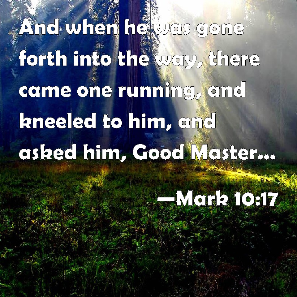 Choose a Background Mark 10:17 And when he was gone forth into the way, there came one running, and kneeled to him, and asked him, Good Master, what shall I do that I may inherit eternal life? KJV: And when he was gone forth into the way, there came one running, and kneeled to him, and asked him, Good Master, what shall I do that I may inherit eternal life? DRB: And when he was gone forth into the way, a certain man running up and kneeling before him, asked him, Good Master, what shall I do that I may receive life everlasting? DBT: And as he went forth into the way, a person ran up to him, and kneeling to him asked him, Good Teacher, what shall I do that I may inherit eternal life? ERV: And as he was going forth into the way, there ran one to him, and kneeled to him, and asked him, Good Master, what shall I do that I may inherit eternal life? WBT: And when he had gone forth into the way, there came one running, and kneeled to him, and asked him, Good Master, what shall I do that I may inherit eternal life? WEB: As he was going out into the way, one ran to him, knelt before him, and asked him, "Good Teacher, what shall I do that I may inherit eternal life?" YLT: And as he is going forth into the way, one having run and having kneeled to him, was questioning him, 'Good teacher, what may I do, that life age-during I may inherit?'Links Mark 10:17 NIV • Mark 10:17 NLT • Mark 10:17 ESV • Mark 10:17 NASB • Mark 10:17 KJV • Mark 10:17 Interlinear • Mark 10:17 Commentaries • Mark 10:17 Parallel Texts • Mark 10:17 Bible Apps • Mark 10:17 Parallel • Bible Hub |