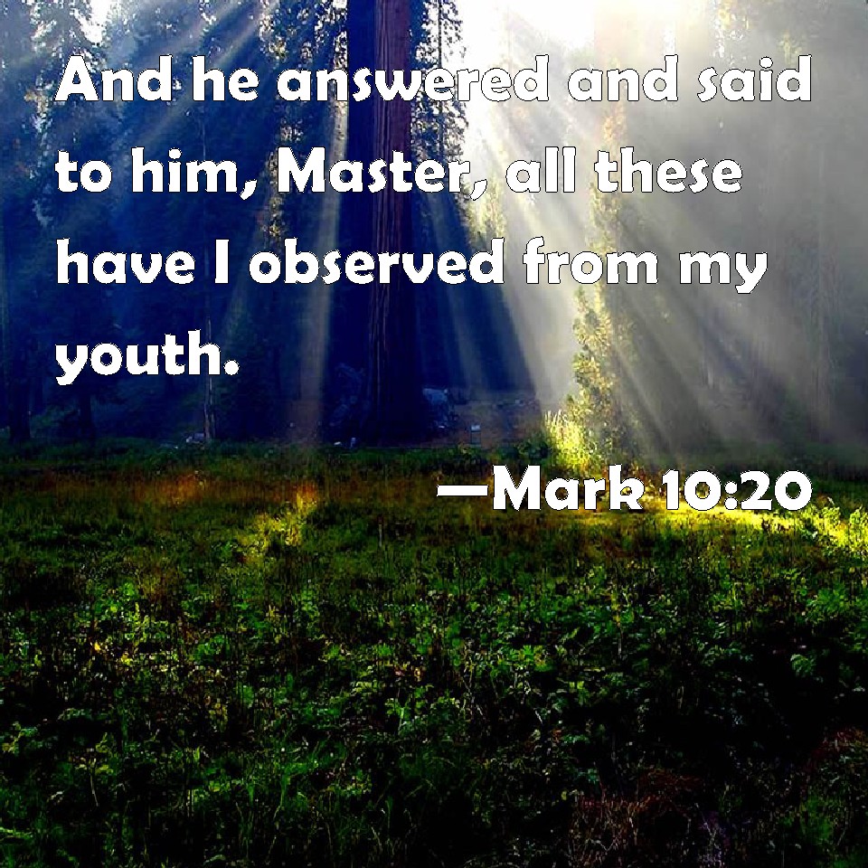 Choose a Background Mark 10:20 And he answered and said to him, Master, all these have I observed from my youth. KJV: And he answered and said unto him, Master, all these have I observed from my youth. DRB: But he answering, said to him: Master, all these things I have observed from my youth. DBT: And he answering said to him, Teacher, all these things have I kept from my youth. ERV: And he said unto him, Master, all these things have I observed from my youth. WBT: And he answered and said to him, Master, all these have I observed from my youth. WEB: He said to him, "Teacher, I have observed all these things from my youth." YLT: And he answering said to him, 'Teacher, all these did I keep from my youth.'Links Mark 10:20 NIV • Mark 10:20 NLT • Mark 10:20 ESV • Mark 10:20 NASB • Mark 10:20 KJV • Mark 10:20 Interlinear • Mark 10:20 Commentaries • Mark 10:20 Parallel Texts • Mark 10:20 Bible Apps • Mark 10:20 Parallel • Bible Hub |