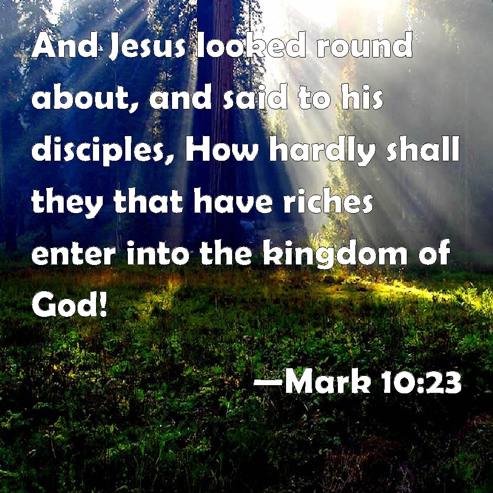 Choose a Background Mark 10:23 And Jesus looked round about, and said to his disciples, How hardly shall they that have riches enter into the kingdom of God! KJV: And Jesus looked round about, and saith unto his disciples, How hardly shall they that have riches enter into the kingdom of God! DRB: And Jesus looking round about, saith to his disciples: How hardly shall they that have riches, enter into the kingdom of God! DBT: And Jesus looking around says to his disciples, How difficultly shall they that have riches enter into the kingdom of God! ERV: And Jesus looked round about, and saith unto his disciples, How hardly shall they that have riches enter into the kingdom of God! WBT: And Jesus looked around, and saith to his disciples, How hardly shall they that have riches enter into the kingdom of God! WEB: Jesus looked around, and said to his disciples, "How difficult it is for those who have riches to enter into the Kingdom of God!" YLT: And Jesus having looked round, saith to his disciples, 'How hardly shall they who have riches enter into the reign of God!'Links Mark 10:23 NIV • Mark 10:23 NLT • Mark 10:23 ESV • Mark 10:23 NASB • Mark 10:23 KJV • Mark 10:23 Interlinear • Mark 10:23 Commentaries • Mark 10:23 Parallel Texts • Mark 10:23 Bible Apps • Mark 10:23 Parallel • Bible Hub |