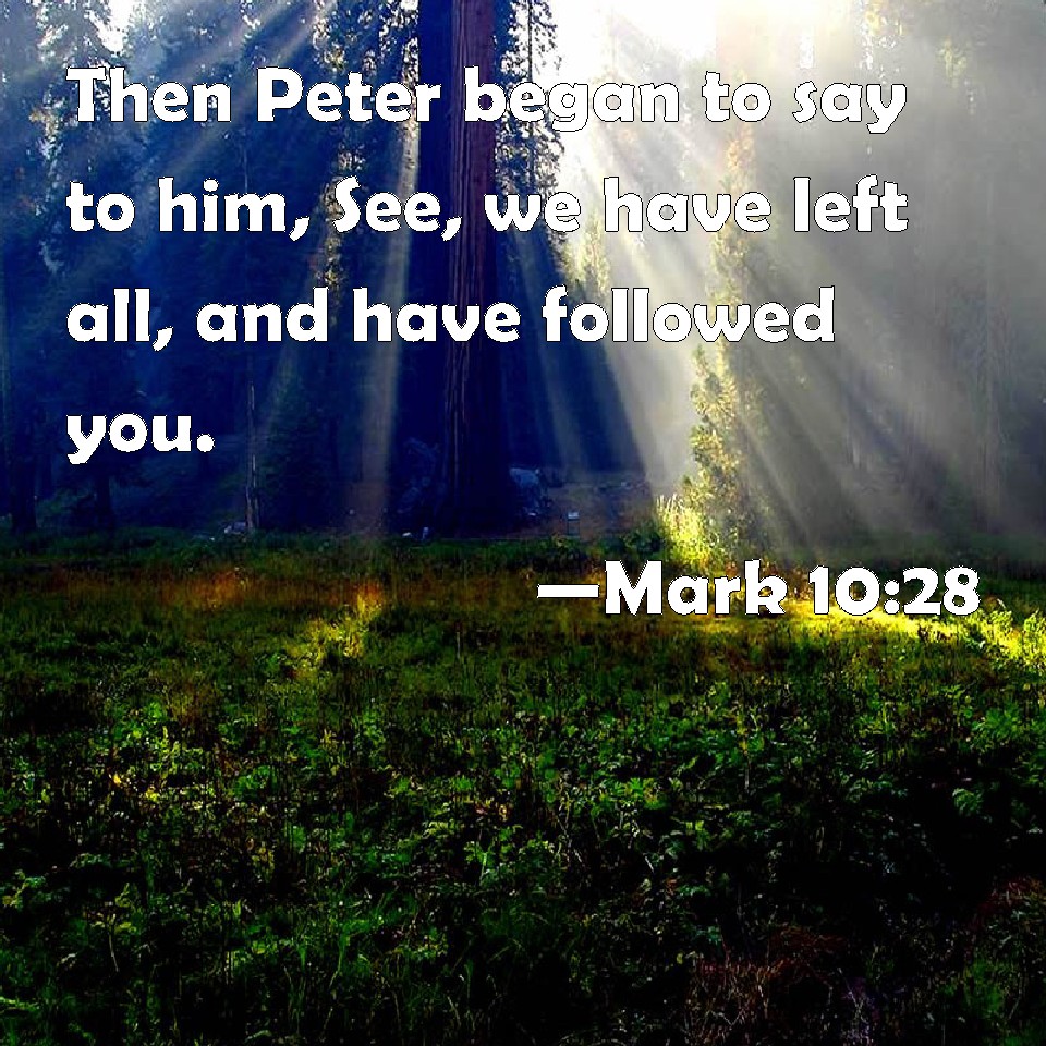 Choose a Background Mark 10:28 Then Peter began to say to him, See, we have left all, and have followed you. KJV: Then Peter began to say unto him, Lo, we have left all, and have followed thee. DRB: And Peter began to say unto him: Behold, we have left all things, and have followed thee. DBT: Peter began to say to him, Behold, we have left all things and have followed thee. ERV: Peter began to say unto him, Lo, we have left all, and have followed thee. WBT: Then Peter began to say to him, Lo, we have left all, and have followed thee. WEB: Peter began to tell him, "Behold, we have left all, and have followed you." YLT: And Peter began to say to him, 'Lo, we left all, and we followed thee.'Links Mark 10:28 NIV • Mark 10:28 NLT • Mark 10:28 ESV • Mark 10:28 NASB • Mark 10:28 KJV • Mark 10:28 Interlinear • Mark 10:28 Commentaries • Mark 10:28 Parallel Texts • Mark 10:28 Bible Apps • Mark 10:28 Parallel • Bible Hub |
