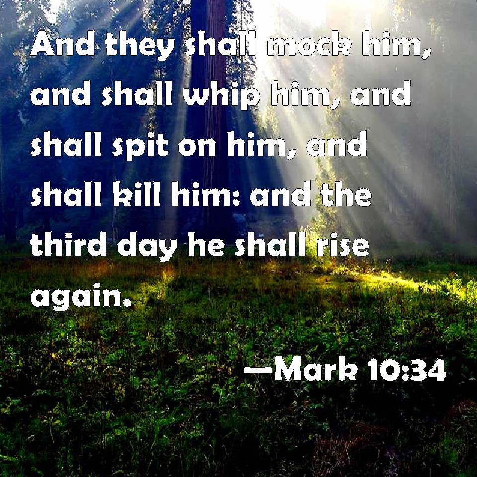 Choose a Background Mark 10:34 And they shall mock him, and shall whip him, and shall spit on him, and shall kill him: and the third day he shall rise again. KJV: And they shall mock him, and shall scourge him, and shall spit upon him, and shall kill him: and the third day he shall rise again. DRB: And they shall mock him, and spit on him, and scourge him, and kill him: and the third day he shall rise again. DBT: and they shall mock him, and shall scourge him, and shall spit upon him, and shall kill him; and after three days he shall rise again. ERV: and they shall mock him, and shall spit upon him, and shall scourge him, and shall kill him; and after three days he shall rise again. WBT: And they will mock him, and will scourge him, and will spit upon him, and will kill him: and the third day he will rise again. WEB: They will mock him, spit on him, scourge him, and kill him. On the third day he will rise again." YLT: and they shall mock him, and scourge him, and spit on him, and kill him, and the third day he shall rise again.'Links Mark 10:34 NIV • Mark 10:34 NLT • Mark 10:34 ESV • Mark 10:34 NASB • Mark 10:34 KJV • Mark 10:34 Interlinear • Mark 10:34 Commentaries • Mark 10:34 Parallel Texts • Mark 10:34 Bible Apps • Mark 10:34 Parallel • Bible Hub |
