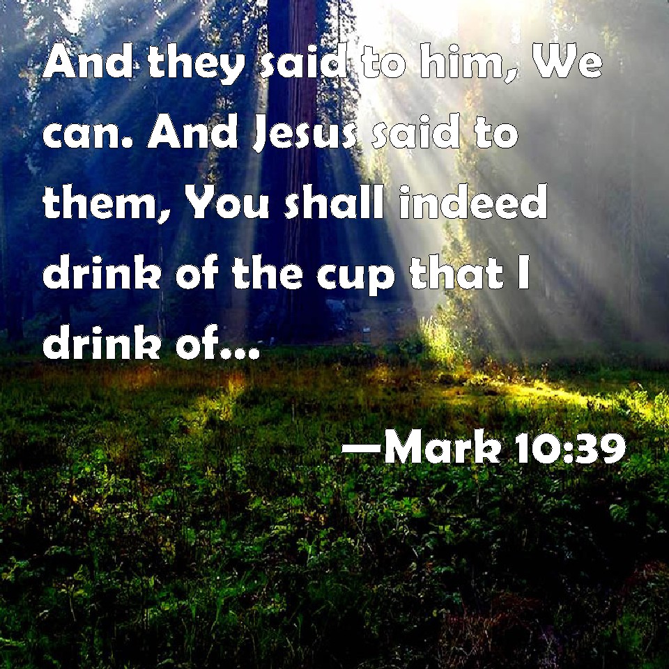 Choose a Background Mark 10:39 And they said to him, We can. And Jesus said to them, You shall indeed drink of the cup that I drink of; and with the baptism that I am baptized with shall you be baptized: KJV: And they said unto him, We can. And Jesus said unto them, Ye shall indeed drink of the cup that I drink of; and with the baptism that I am baptized withal shall ye be baptized: DRB: But they said to him: We can. And Jesus saith to them: You shall indeed drink of the chalice that I drink of: and with the baptism wherewith I am baptized, you shall be baptized. DBT: And they said to him, We are able. And Jesus said to them, The cup that I drink ye will drink and with the baptism that I am baptised with ye will be baptised, ERV: And they said unto him, We are able. And Jesus said unto them, The cup that I drink ye shall drink; and with the baptism that I am baptized withal shall ye be baptized: WBT: And they said to him, We can. And Jesus said to them, Ye shall indeed drink of the cup that I drink of: and with the baptism that I am baptized with shalt ye be baptized; WEB: They said to him, "We are able." Jesus said to them, "You shall indeed drink the cup that I drink, and you shall be baptized with the baptism that I am baptized with; YLT: And they said to him, 'We are able;' and Jesus said to them, 'Of the cup indeed that I drink of, ye shall drink, and with the baptism that I am baptized with, ye shall be baptized;Links Mark 10:39 NIV • Mark 10:39 NLT • Mark 10:39 ESV • Mark 10:39 NASB • Mark 10:39 KJV • Mark 10:39 Interlinear • Mark 10:39 Commentaries • Mark 10:39 Parallel Texts • Mark 10:39 Bible Apps • Mark 10:39 Parallel • Bible Hub |